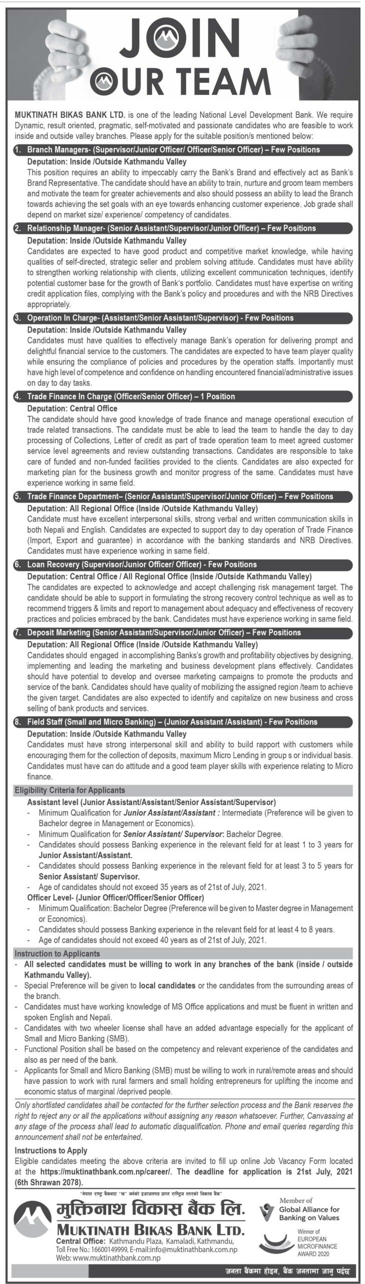 बैंकले ब्राञ्च र रिलेसनशीप म्यानेजर, अप्रेशन र ट्रेड फाइनान्स इन्चार्ज, डिपोजिट म्यानेजर, लोन रिकोवरी र फिल्ड स्टाफ पदको लागि दरखास्त माग गरेको हो । जसमा ती पदहरुको लागि बैंकले सिनियर तथा जुनियर–सुपरभाइजर, अफिसर र असिस्टेन माग गरेको छ । तोकिएको शैक्षिक योग्यता र अनुभव प्राप्त इच्छुक आवेदकले बैंकको आधिकारीक वेव साइटमार्फत् साउन ६ गतेसम्म आवेदन दिनसक्ने बैंकले जनाएको छ ।
