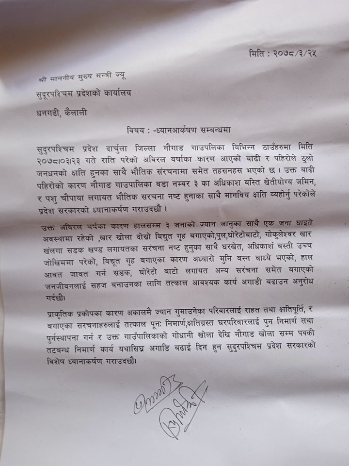 विभिन्न ठाउँमा असार २३ गते राति परेको अविरल बर्षाका कारण गएको बाढी र पहिरोले ठुलो जनधनको क्षति गर्नुका साथै भौतिक संरचनामा समेत तहसनहस भएको र उक्त बाढी पहिरोको कारण नौगाड गाउँपालिका वडा नं. ३ का अधिकांश बस्ती, खेतियोग्य जमिन र पशुचौपाया लगायत भौतिक संरचना नष्ट भएको उक्त पत्रमा उल्लेख गरेको छ । साथै ३ जनाले ज्यान समेत गुमाईसकेको, एक जना घाइते अवस्थामा रहेको समेत ध्यानाकर्षण गराएको छ ।
