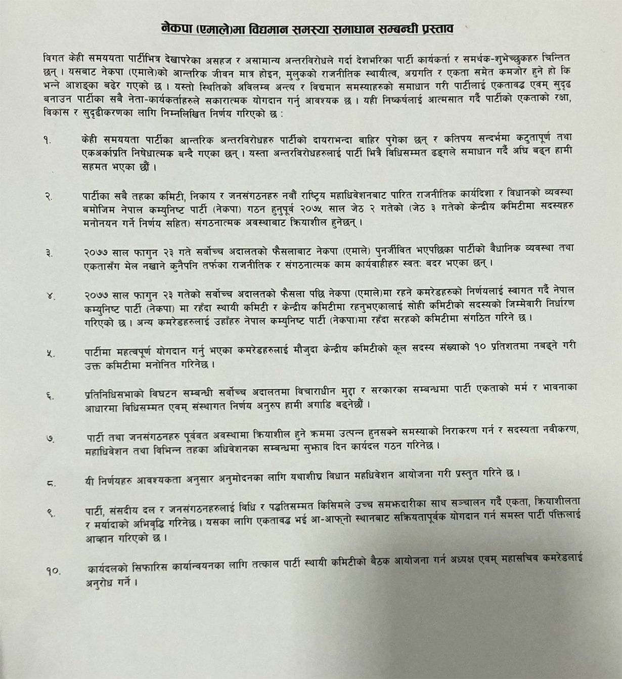 दुबै पक्षका नेताहरु रहेको कार्यदलले सर्वोच्च अदालतमा विचाराधीन प्रतिनिधिसभा विघटनसम्बन्धी मुद्दा र सरकारबारे पार्टी एकताको मर्म र भावनाका आधारमा विधिसम्मत एवं संस्थागत निर्णय अनुसार अगाडि बढ्ने सहमति गरेको छ ।