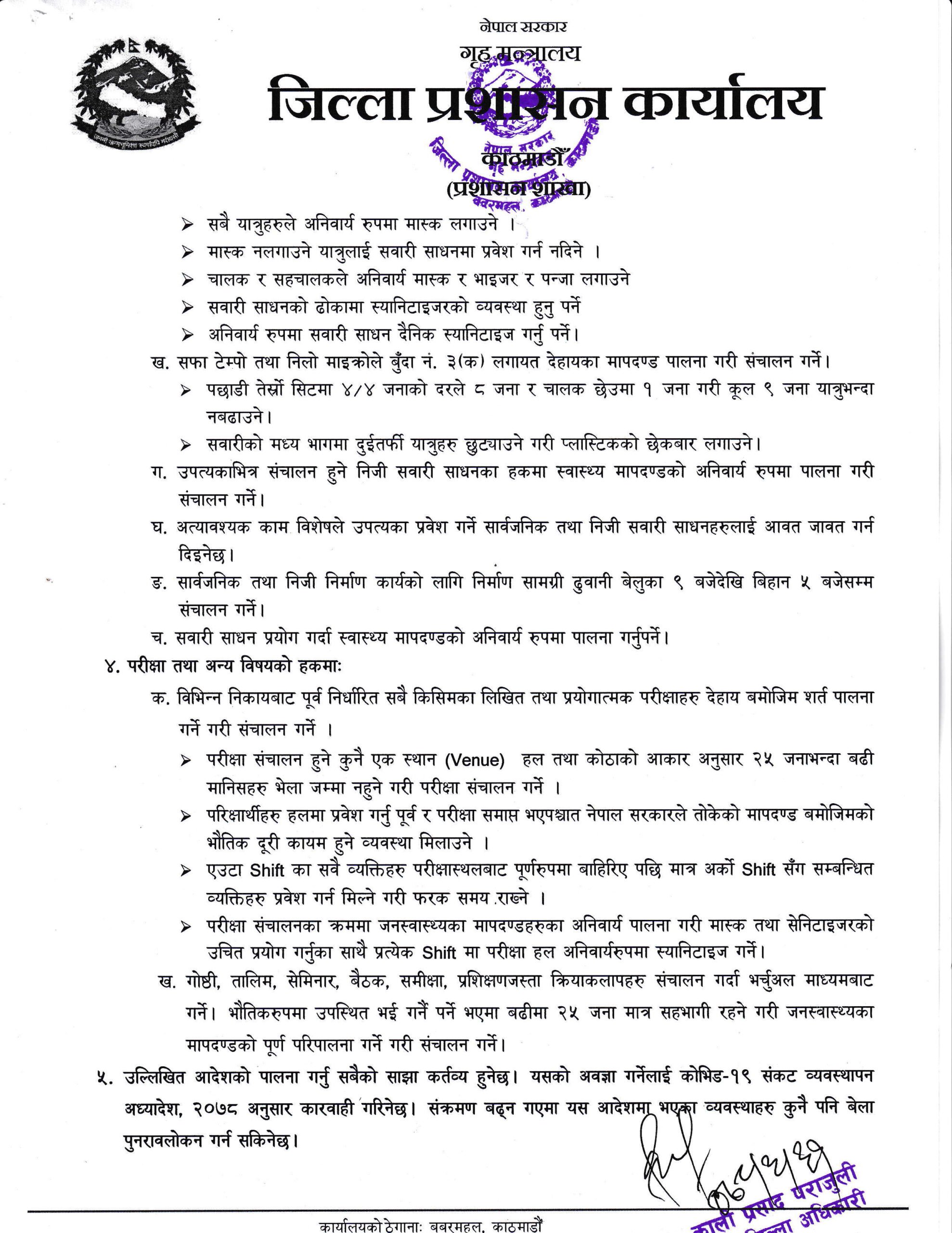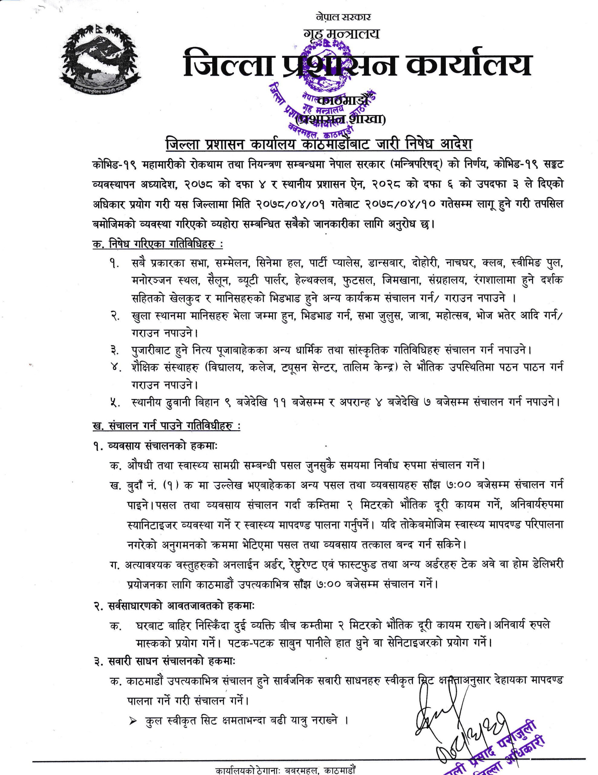 बिहीबार काठमाडौं उपत्यकाका तीनै जिल्ला प्रशासन कार्यालयका प्रमुखहरूको बैठकले भोलिदेखि १० गते सम्मको लागि निषेधाज्ञा लम्ब्याउने निर्णय गरेको हो ।