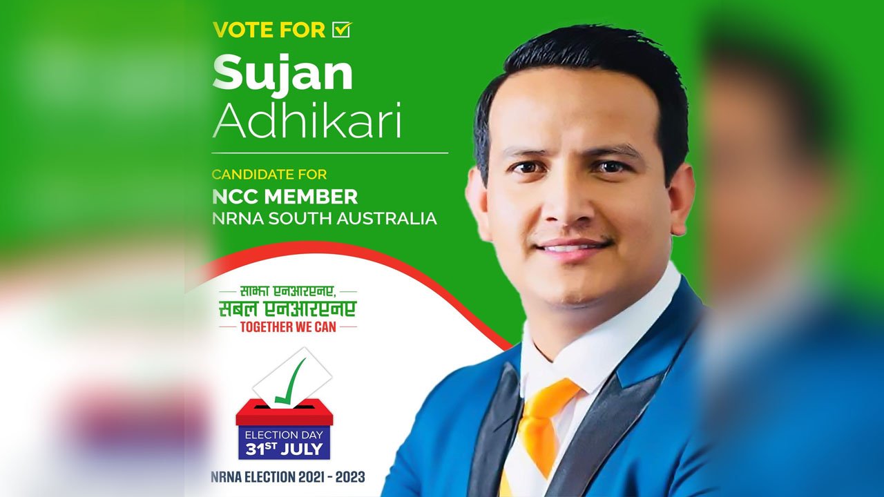 गैर आवासिय नेपाली संघ अष्ट्रेलियाको निर्वाचन यहि आउँदो जुलाई ३१ मा हुने भएको छ । साउथ अष्ट्रेलियामा नेपाली समाजको जनसंख्या बढ्दै गइरहेको अवस्था छ र यसलाई अझ राम्रो सामाजिक वातावरणको सृजना गर्न सबैको साथ र सहयोगको आजको आवश्यकता बन्न पुगेको छ । यहि आवश्कतालाई मध्यनजर गर्दै निर्वाचनममा साउथ अस्ट्रेलियाबाट राष्ट्रिय समन्वय समिति सदस्य उम्मेदवारको रुपमा प्रस्तुत हुने सुजन अधिकारीले बताएका छन् ।
