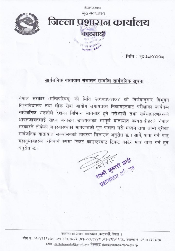 साउन १० सम्म निषेधाज्ञा लम्ब्याइएपनि लोकसेवा र विश्वविद्यालयका परीक्षाको विभिन्न समय, मिति सार्वजनिक भएकाले आवागमनलाई मध्यनजर गर्दै मध्यम तथा लामो दूरीको यातायात सञ्चालन गर्ने निर्णय गरेको प्रशासन कार्यालयले जनाएको छ ।