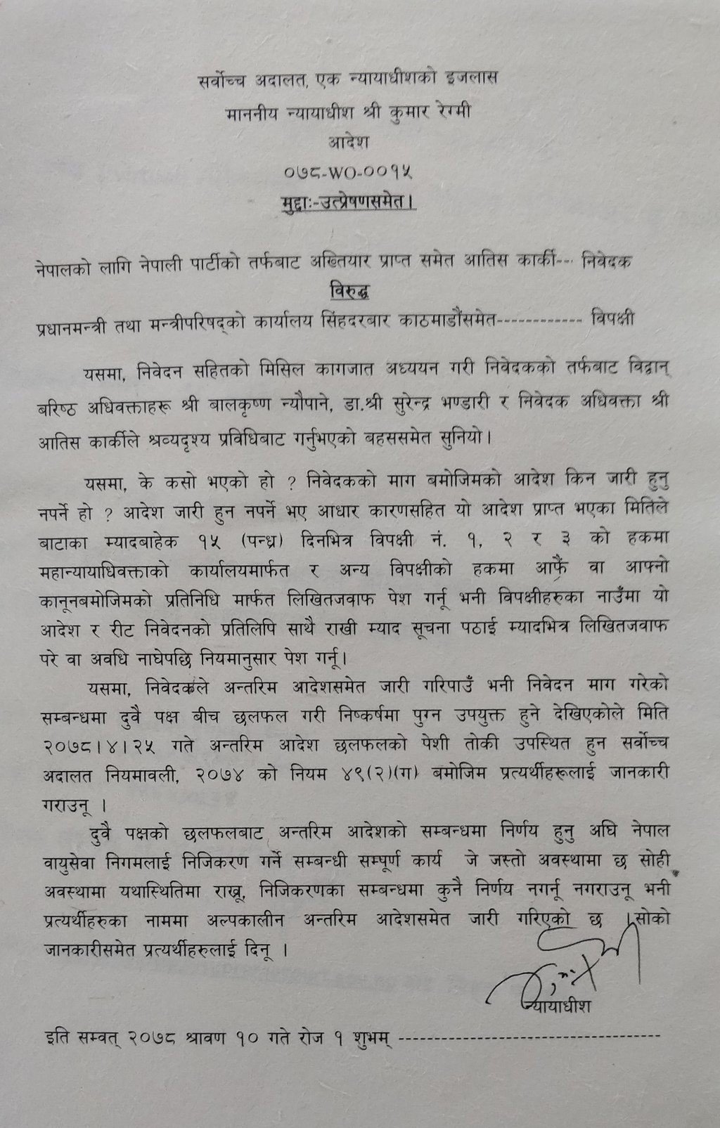 सर्वोच्चमा अधिवक्ता आतिस कार्कीले दायर गरेको रिटमा निवेदनमा न्यायाधीश कुमार रेग्मीको एकल इजलासले अल्पकालीन अन्तरिम आदेश जारी गर्दै सो सम्बनधी कुनै पनि काम अघि नबढाउन भनेको हो ।