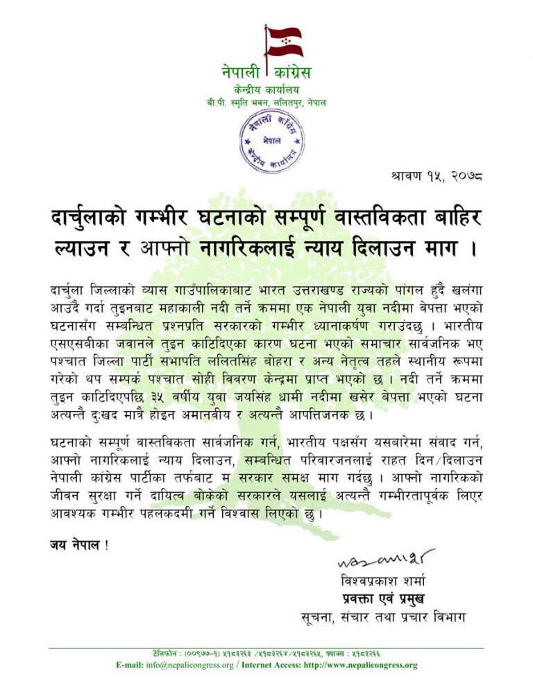 विज्ञप्तिमा भनिएको छ, ‘दार्चुला जिल्लाको व्यास गाउँपालिकाबाट भारत उत्तराखण्ड राज्यको पांगल हुँदै खलंगा आउंदै गर्दा तुइनबाट महाकाली नदी तर्ने क्रममा एक नेपाली युवा नदीमा वेपत्ता भएको घटनासँग सम्बन्धित प्रश्नप्रति सरकारको गम्भीर ध्यानाकर्षण गराउंदछु । भारतीय एसएसबीका जवानले तुइन काटिदिएका कारण घटना भएको समाचार सार्वजनिक भए पश्चात जिल्ला पार्टी सभापति ललितसिंह बोहरा र अन्य नेतृत्व तहले स्थानीय रूपमा गरेको थप सम्पर्क पश्चात सोही विवरण केन्द्रमा प्राप्त भएको छ । नदी तर्ने क्रममा तुइन काटिदिएपछि ३५ वर्षीय युवा जयसिंह धामी नदीमा खसेर बेपत्ता भएको घटना अत्यन्तै दुःखद मात्रै होइन अमानवीय र अत्यन्तै आपत्तिजनक छ ।’
