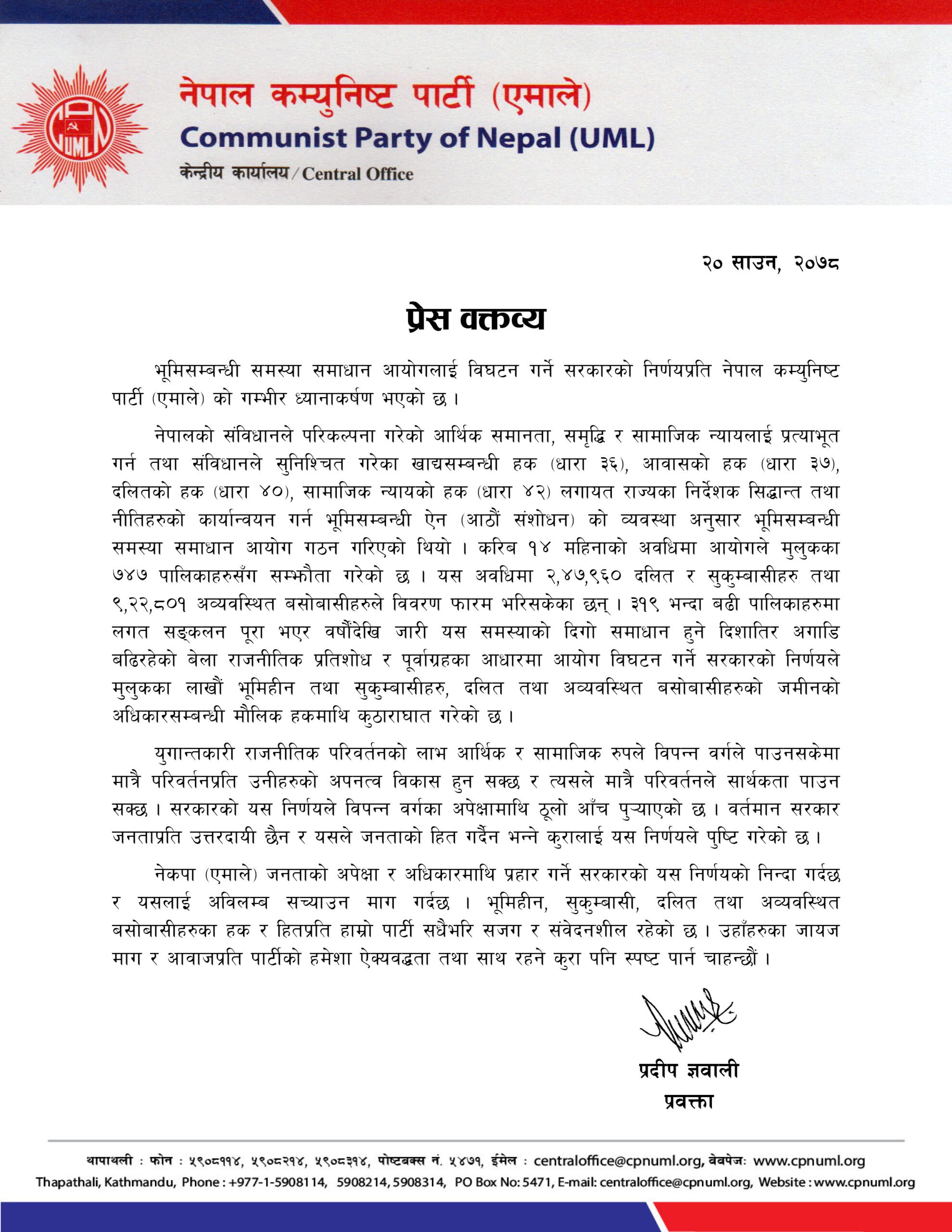 ३१९ भन्दा बढी पालिकाहरुमा लगत सङ्कलन पूरा भएर वर्षौंदेखि जारी समस्याको दिगो समाधान हुने दिशातिर सरकार अगाडि बढिरहेको बेला राजनीतिक प्रतिशोध र पूर्वाग्रहका आधारमा आयोग विघटन गर्ने सरकारको निर्णयले मुलुकका लाखौं भूमिहीन तथा सुकुम्बासीहरू, दलित तथा अव्यवस्थित बसोबासीहरुको जमीनको अधिकारसम्बन्धी मौलिक हकमाथि कुठाराघात गरेको एमालेको विज्ञप्तिमा उल्लेख छ ।