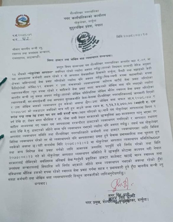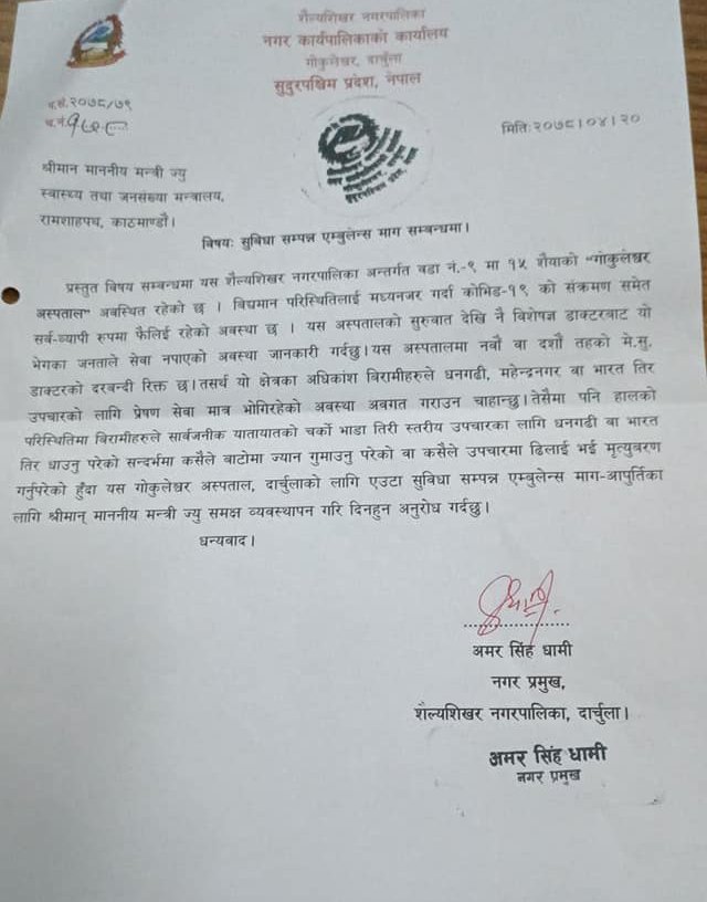 एक पत्र हस्तान्तरण गर्दै मेयर धामीले अस्पतालमा नवौँ, दशौँ तहको मेसु डाक्टरको दरबन्दी रिक्त रहेको समेत अवगत गराए । गोकुलेश्वर अस्पतालका विरामीहरु धनगढी, महेन्द्रनगर तथा भारत तिर रेफर गर्न एम्बुलेन्सको आवश्यकता रहेकोले यस अवस्थामा विरामीका आफन्तले चर्काे शुल्क तिरेर नीजि सवारी साधनको प्रयोग गर्नुपर्ने बाध्यता रहेकोले यसतर्फ ध्यानाकर्षण गराएको थियो ।