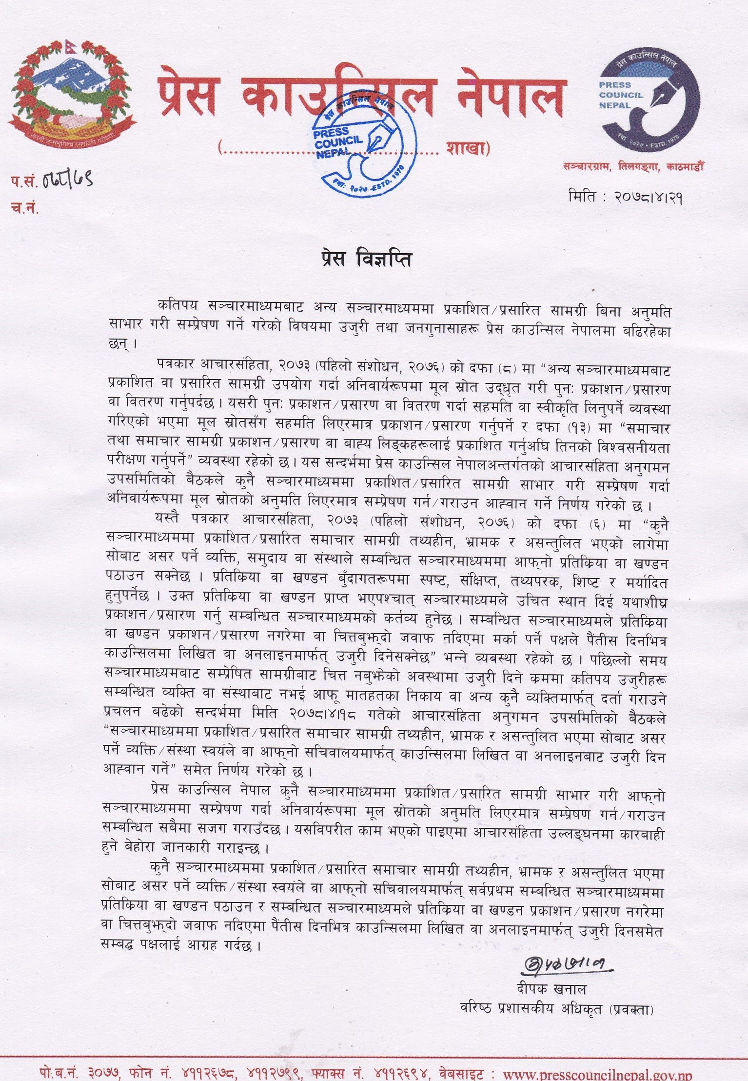 काउन्सिलको आचारसंहिता अनुगमन उपसमितिको बैठकको निर्णय समेतको आधारमा आज एक विज्ञप्ति जारी गर्दै सञ्चारमाध्यममा प्रकाशित/प्रसारित सामग्री बिना अनुमति साभार गरी सम्प्रेषण गर्ने गरेको विषयमा उजुरी तथा जनगुनासाहरू बढेको भन्दै यस्तो निर्णय गरेको जनाएको छ ।