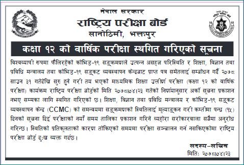 बोर्डको शनिबारको बैठकले कक्षा १२ को परीक्षा हाललाई स्थगित गरेको थियो । साथै बोर्डले कोरोनाले गर्दा तोकिएको समयमा परीक्षा सञ्चालन गर्न नसकेकोमा दुःख व्यक्तसमेत गरेको छ ।