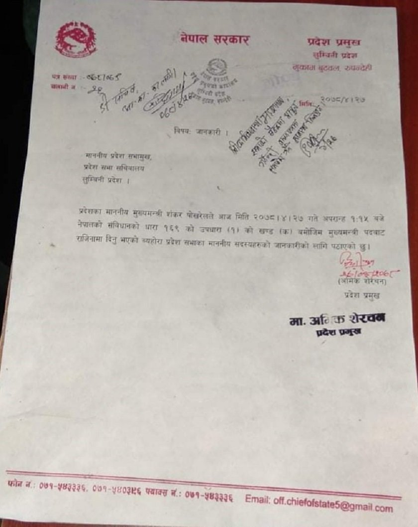 काठमाडौँ – लुम्बिनी प्रदेशका मुख्यमन्त्री शंकर पोखरेलको राजीनामा स्वीकृत भएको छ । प्रदेश प्रमुख अमिक शेरचनले पोखरेलको राजीनामा स्वीकृत गरेका हुन् । आज मुख्यमन्त्री पोखरेलविरुद्ध प्रदेशसभामा दायर भएको अविश्वास प्रस्तावमाथि छलफल र निर्णय हुने कार्यतालिका थियो । सोही बीचमा मुख्यमन्त्री पोखरेलले राजीनामा दिएका छन् । मुख्यमन्त्रीले बुझाएको राजीनामा स्वीकृत गरिएको प्रदेश प्रमुखको कार्यालयले जनाएको छ । प्रदेश प्रमुखको कार्यालयले उक्त पत्र प्रदेशसभामा पनि पठाएको छ ।