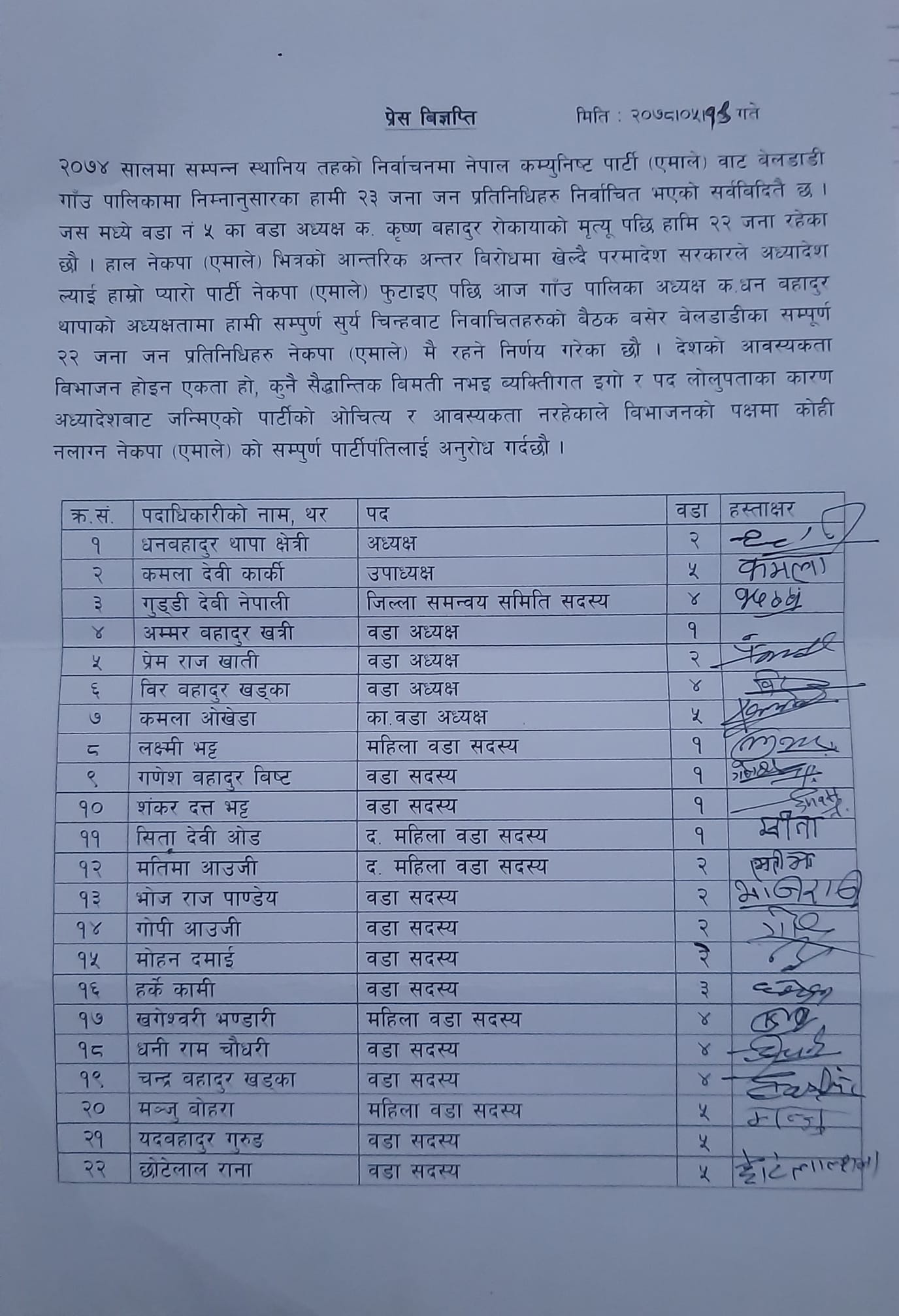 शनिवार एक विज्ञप्ती जारी गर्दै गाउँपालिका अध्यक्ष धनबहादुर थापा क्षेत्री, उपाध्यक्ष कमला कार्की सहित २२ जना नेकपा एमाले मै रहने निर्णय गरेको वडा सदस्य शंकरदत्त भट्टले बताए । हाल नेकपा एमाले भित्रको आन्तरिक अन्तर विरोधमा खेल्दै परमादेश सरकारले अध्यादेश ल्याई नेकपा एमाले फुटाएपछि गाउँपलिका अध्यक्ष थापा क्षेत्रीको अध्यक्षतामा सूर्य चिन्हबाट निर्वाचितहरुको बैठक बसी बेलडाँडीका सम्पूर्ण२२ जना जनप्रतिनिधिहरु नेकपा एमाले मै रहने निर्णय गरेको समेत सदस्य भट्टले बताए ।