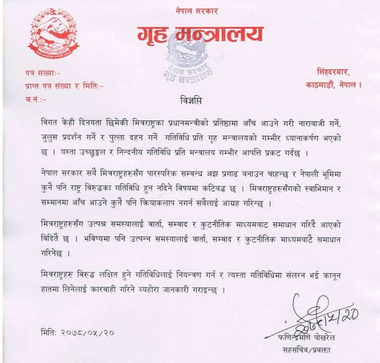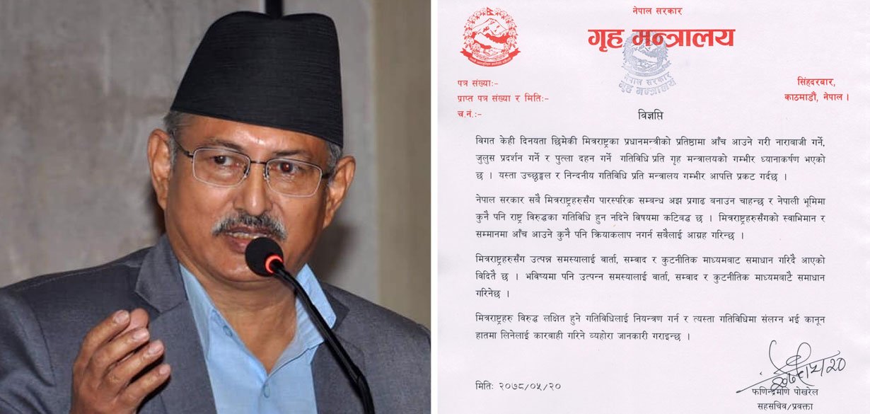 दार्चुलामा नेपाली नागरिक तुइनबाट खसेर महाकाली नदीमा बेपत्ता भएको घटनालाई लिएर नेकपा एकीकृत समाजवादीको विद्यार्थी संगठनले शुक्रबार भारतीय प्रधानमन्त्री नरेन्द्र मोदीको पुत्ला दहन गरेको थियो । गृह मन्त्रालयले मित्रराष्ट्रहरु विरुद्ध लक्षित हुने गतिविधि नियन्त्रण गर्न र त्यस्ता गतिविधिमा संलग्नलाई कारबाही गरिने पनि जनाएको छ । ‘नेपाल सरकार सबै मित्रराष्ट्रहरुसँग पारस्परिक सम्बन्ध अझ प्रगाढ बनाउन चाहन्छ र नेपाली भूमिमा कुनै पनि राष्ट्रविरुद्धका गतिविधि हुन नदिने विषयमा कटिवद्ध छ । मित्रराष्ट्रहरुसँगको स्वाभिमान र सम्मानमा आँच आउने कुनै पनि क्रियाकलाप नगर्न सबैलाई आग्रह गरिन्छ’ मन्त्रालयको विज्ञप्तिमा भनिएको छ ।