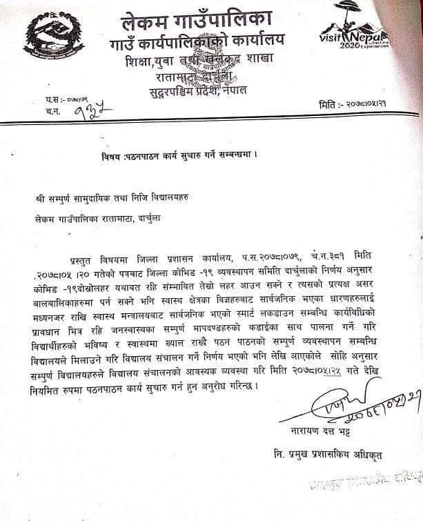 काठमाडौँ – दार्चुलाको लेकम गाउँपालिकामा यहि भदौ २५ गते बाट विद्यालय संचालन हुने भएका छन् । गाउँपालिकाले सोमबार एक सूचना जारी गर्दै गाउँपालिका भित्रका सम्पूर्ण विद्यालयहरुमा २५ गते देखि नियमित पठनपाठन गर्न भनेको छ । जिल्ला प्रशासन कार्यालयको २० गतेको पत्र अनुसार विद्यालय संचालन गर्न सम्पूर्ण स्वास्थ्य मापदण्ड अपानाउने समेत सूचनामा भनिएको छ ।