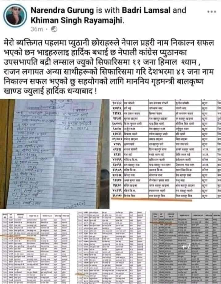 गुरुङले प्युठानबाट कांग्रेसका उपसभापति बद्री लम्सालले सिफारिस गरेको र युवाहरूलाई नाम निकाल्न गृहमन्त्री खाँणले सहयोग गरेको उल्लेख गरेका थिए । सहयोगका लागि भन्दै गृहमन्त्री खाँणलाई फेसबुकमै धन्यवाद दिएका थिए ।