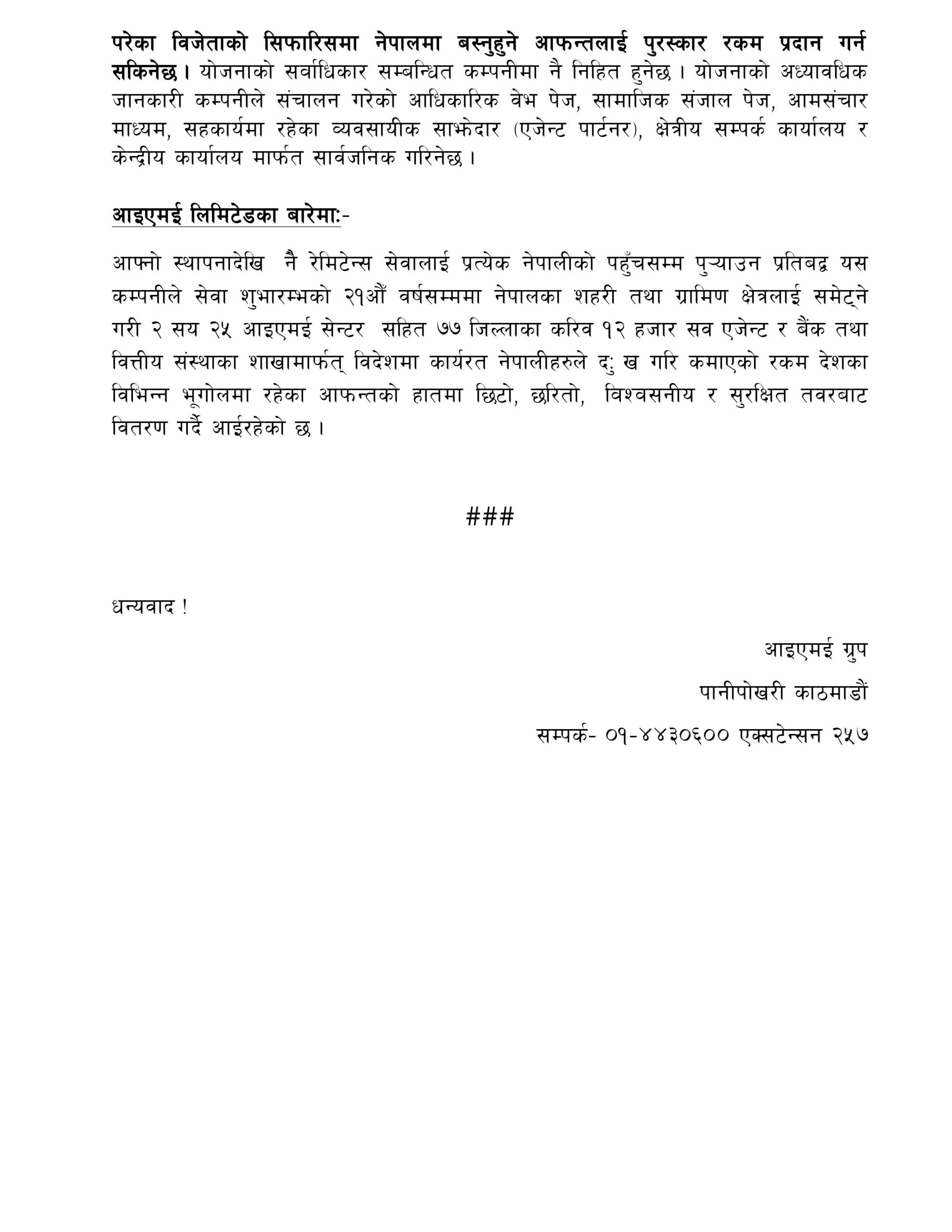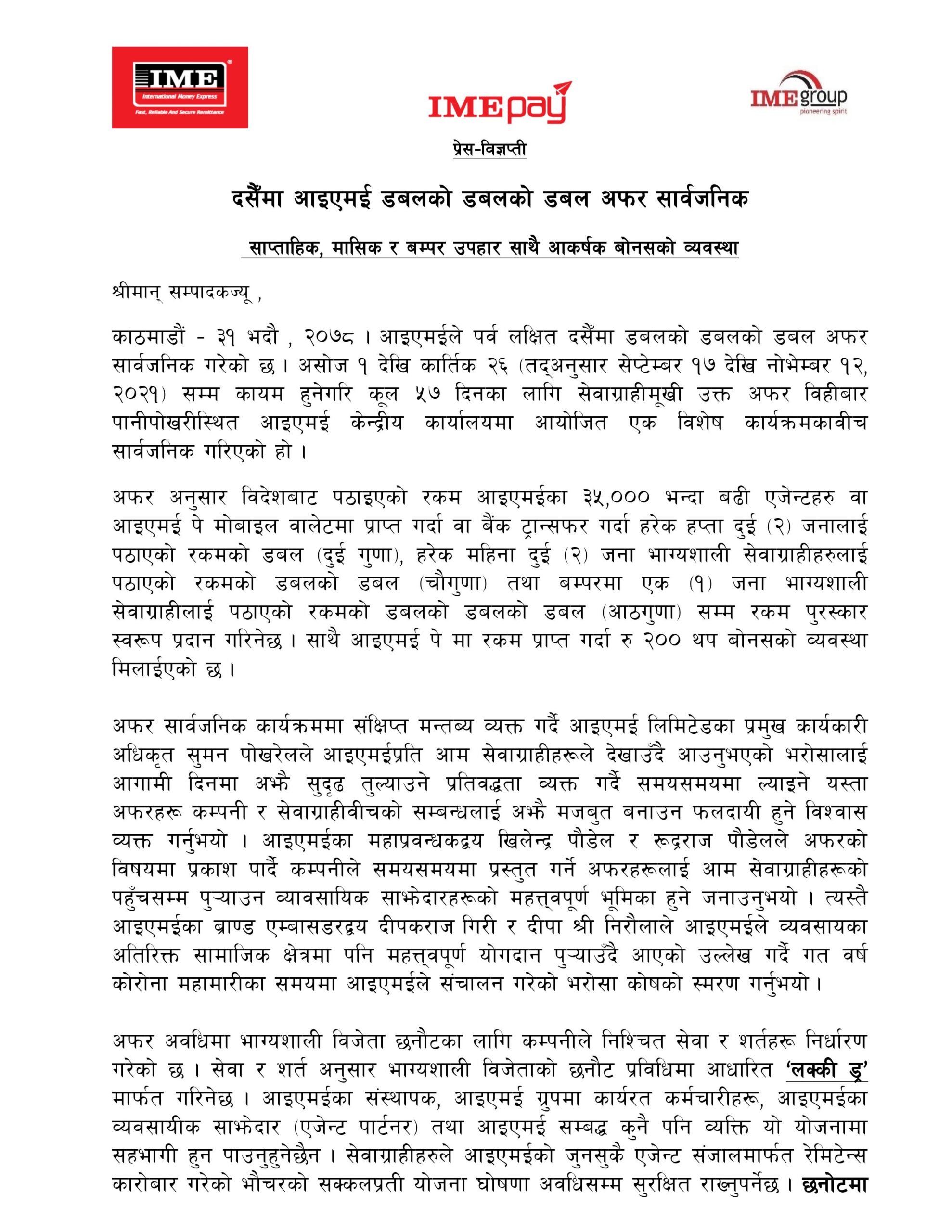 साथै आईएमई पेमा रकम प्राप्त गर्दा दुई सय रुपैयाँ थप बोनसको व्यवस्था मिलाइएको छ ।