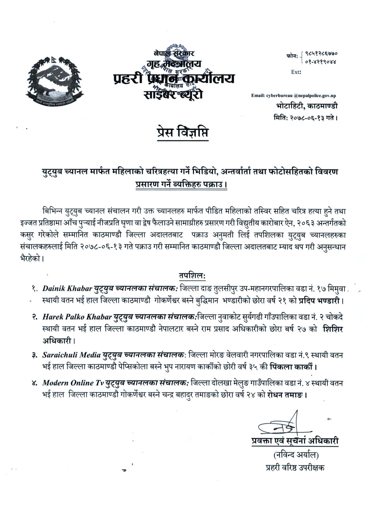 प्रहरीको साइबर ब्युरोको टोलीले दैनिक खबर युट्युब च्यानलका सञ्चालक दाङका २१ वर्षीय प्रदीप भण्डारी, हरेक पलको खबर युट्युब च्यानलका नुवाकोटका २७ वर्षीय शिशिर अधिकारी, सराइचुली मिडिया युट्युब च्यानलका मोरङका ३५ वर्षीया पिंकला कार्की र मोडर्न अनलाइन टीभी युट्युब च्यानलका दोलखाका २४ वर्षीय रोधन तामाङलाई बुधबार पक्राउ गरेको हो ।