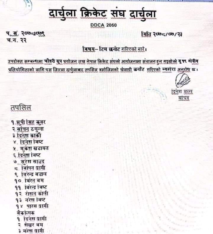 यू १९ क्षेत्रीय प्रतियोगिताको लागि दार्चुलाबाट खेलाडी छनोट (नामावली सहि)