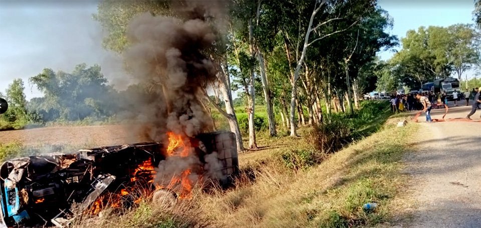 यात्रुवाहक बस दुर्घटनापछि आगो लाग्यो, १२ जना घाइते