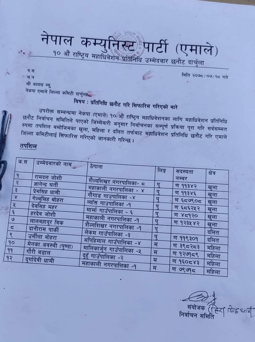 काठमाडाैँ – नेपाल कम्युनिष्ट पार्टी एमाले जिल्ला कमिटी दार्चुलाले राष्ट्रिय महाधिवेशनका लागि प्रतिनिधि छनोट गरि सिफारिस गरेको छ । १० औँ राष्ट्रिय महाधिवेशन प्रतिनिधि छनोट, दार्चुलाले १२ जना छनौट गरि सिफारिस गरेको छ । निर्वाचनका सम्पूर्ण प्रक्रिया पुरा गरि सर्वसम्मत रुपमा खुला, महिला र दलित तर्फबाट महाधिवेशन प्रतिनिधि छनौैट गरि जिल्ला कमिटीलाई सिफारिस गरेको छ ।