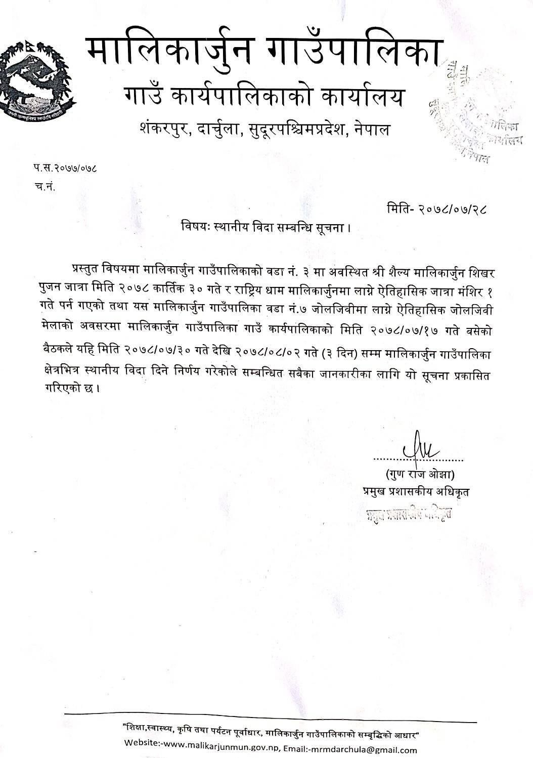कार्तिक ३० गते राष्ट्रकै सातौ धाम मध्येको एउटा धाम मालिकार्जुनमा लाग्ने ऐतिहासिक जात्रा र मंसिर १ गते मालिकार्जुन–७ जोलजिवीमा लाग्ने ऐतिहासिक जोलजिवी मेलाको अवसरमा ३ दिन सार्वजनिक विदा दिएको गाउँपालिकाले जनाएको छ । कार्तिक १७ गते बसेको कार्यपालिकाको बैठकले कार्तिक ३० गते देखि मंसिर २ गते सम्म ३ दिन सार्वजनिक विदा दिने निर्णय गरेको गाउँपालिकाले सूचना मार्फत जानकारी दिएको छ ।