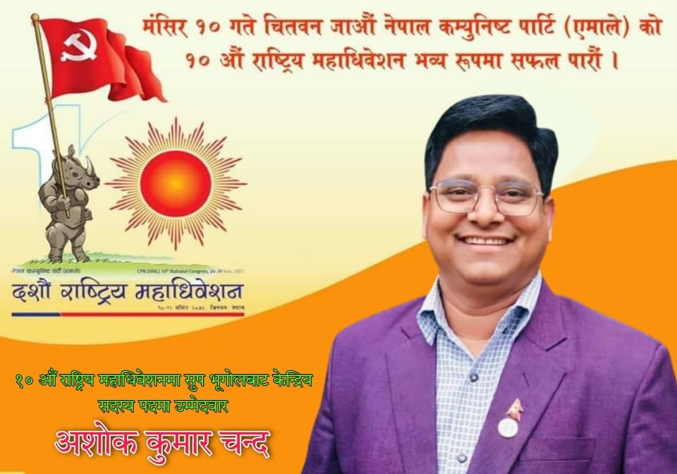 काठमाडौँ – नेकपा एमालेका युवा नेता तथा कञ्चनपुरको बेदकोट नगरपालिकाका नगर प्रमुख अशोक कुमार चन्दले एमालेको दशौं राष्ट्रिय महाअधिवेशनमा केन्द्रीय सदस्यमा उम्मेदवारी घोषणा गरेका छन् । मेयर चन्दले सुदरपश्चि भूगलतर्फबाट केन्द्रीय सदस्यमा उम्मेदवारी घोषणा गरेका हुन् ।