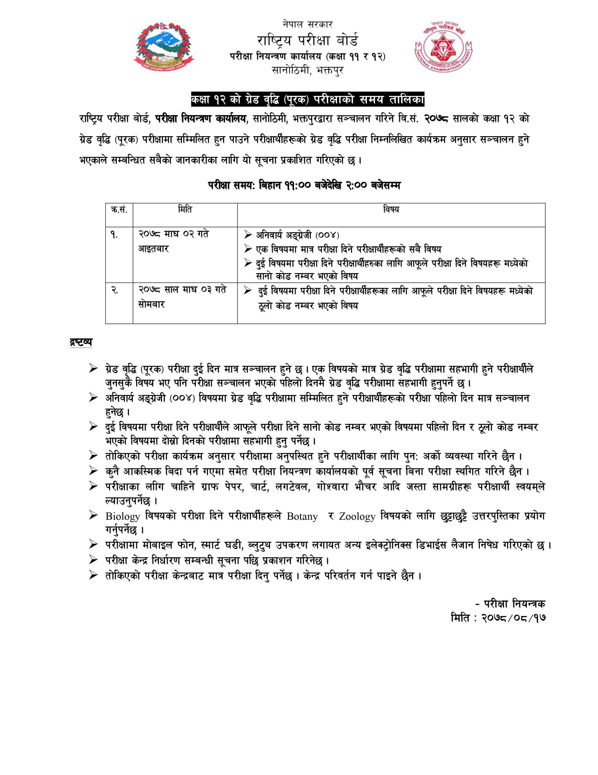 बोर्डले सूचना जारी गर्दै अन्य सबै विषयमा सी प्लस वा सोभन्दा माथिल्लो ग्रेड प्राप्त गरी बाँकी बढीमा दुई विषयमा सी वा डी प्लस ग्रेड प्राप्त गरेका परीक्षार्थीले उक्त दुई वा ती मध्ये कुनै एक विषयमा ग्रेड वृद्घि परीक्षा दिनसक्ने जनाएको छ ।