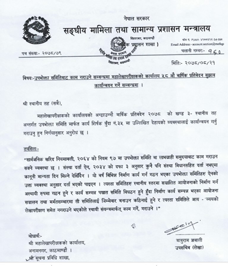 यही सुझाव कार्यान्वयन गर्न मन्त्रालयले स्थानीय तहलाई परिपत्र गरेसँगै जिल्ला प्रशासन कार्यालयमा दर्ता नभएका उपभोक्ता समितिबाट काम गराउन नसकिने अवस्था आएको हो । परिपत्र कार्यान्वयन भएमा अब विधानसहित दर्ता भएका उपभोक्ता समितिले मात्रै काम पाउने छन् ।