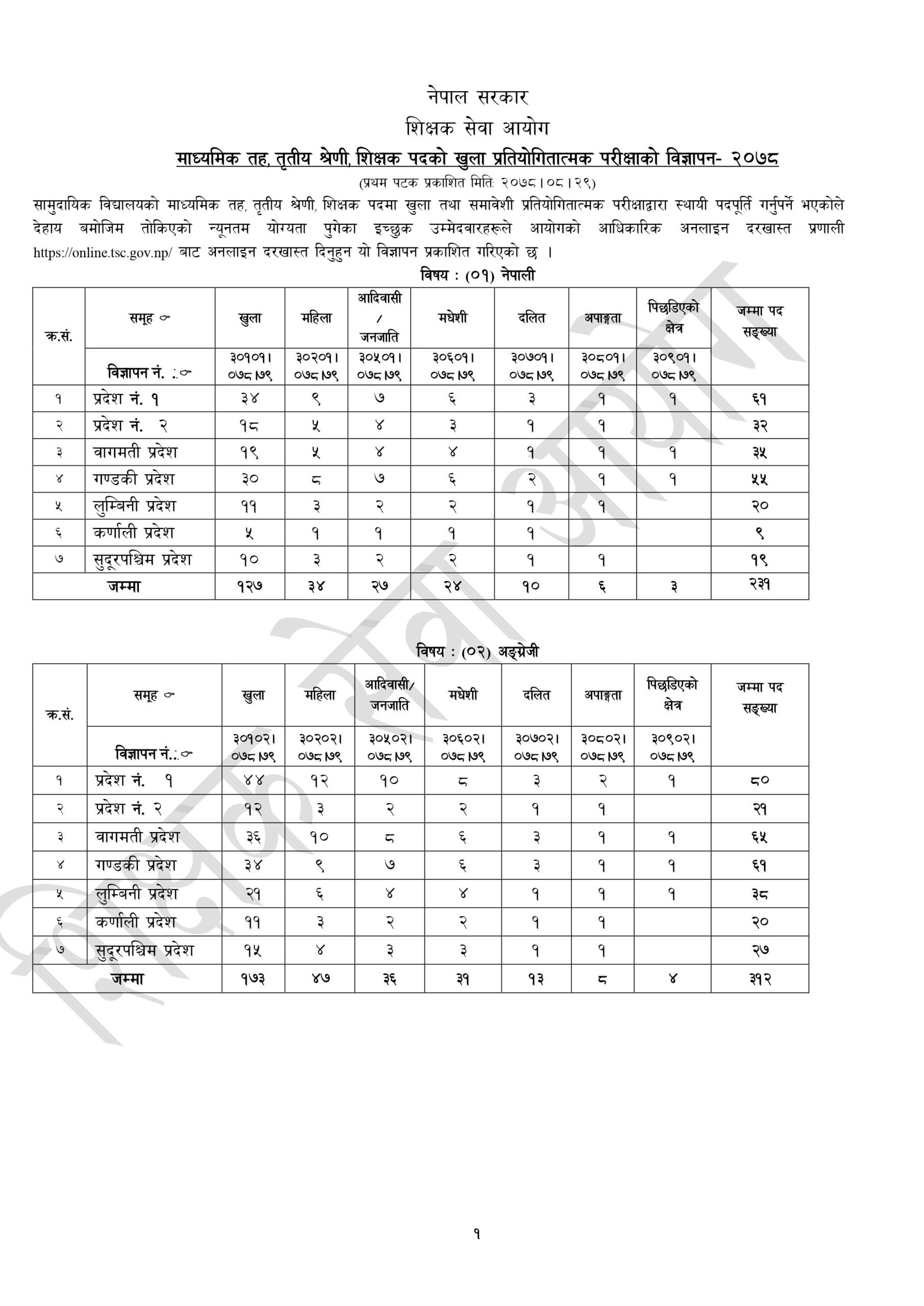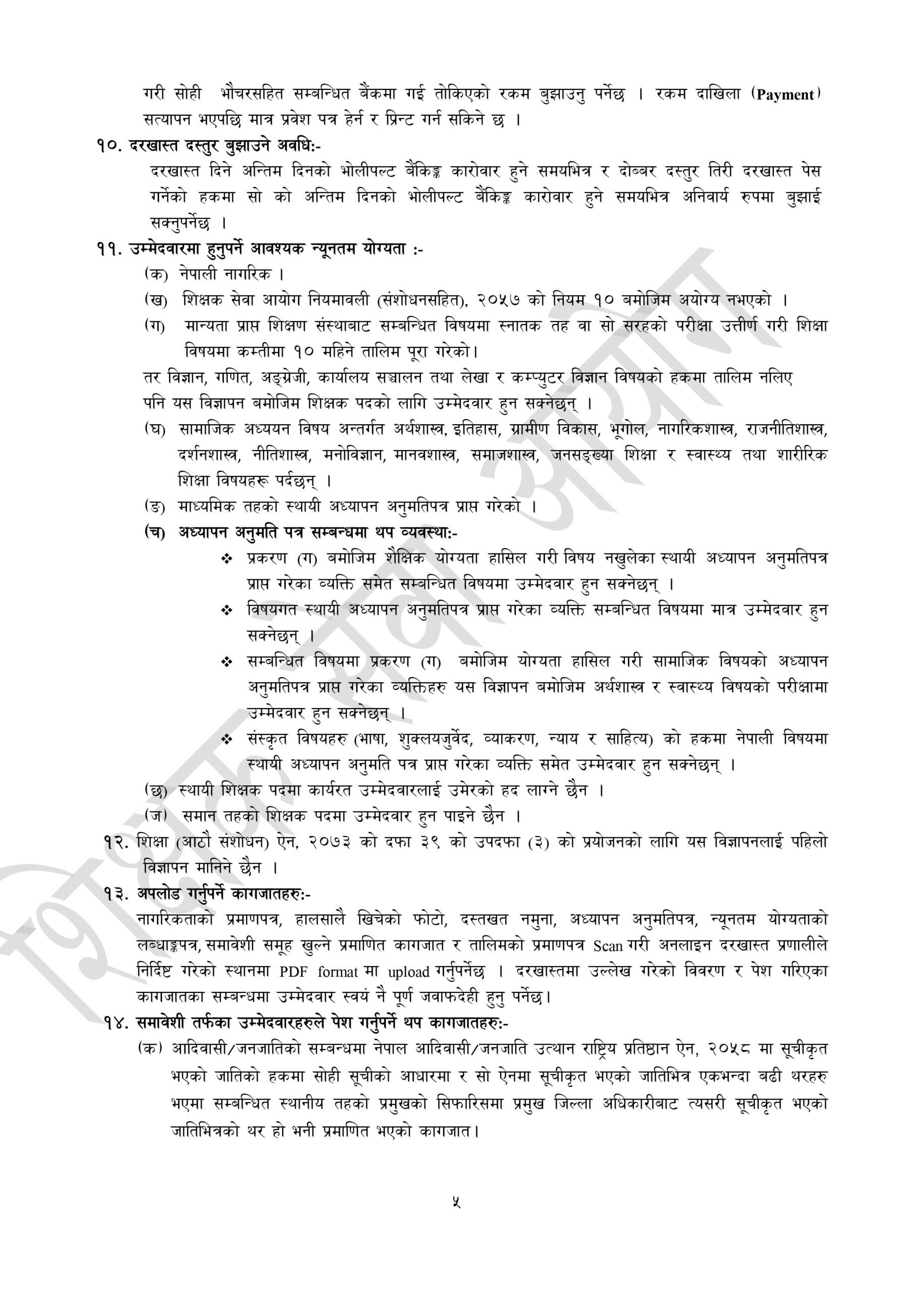आउँदो पुस १ गतेदेखि २९ गतेसम्म नियमित शुल्कमा र माघ ६ गतेसम्म विलम्ब शुल्क तिरेर दरखास्त दिन सकिने आयोगले जनाएको छ । दरखास्त अनलाइनमार्फत् बुझाउन सकिने छ । नेपाली, अंग्रेजी, गणित, विज्ञान, सामाजिक, अर्थशास्त्र, लेखा, शिक्षा, स्वास्थ्य, संस्कृत, कम्प्युटर, शुक्लयजुर्वेद र न्याय विषयका जम्मा एक हजार ५४७ जना शिक्षकका लागि विज्ञापन खुलाइएको हो ।