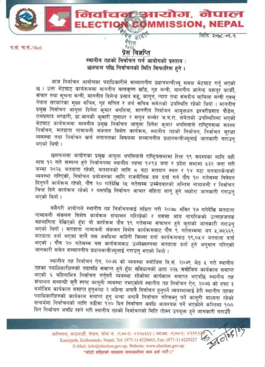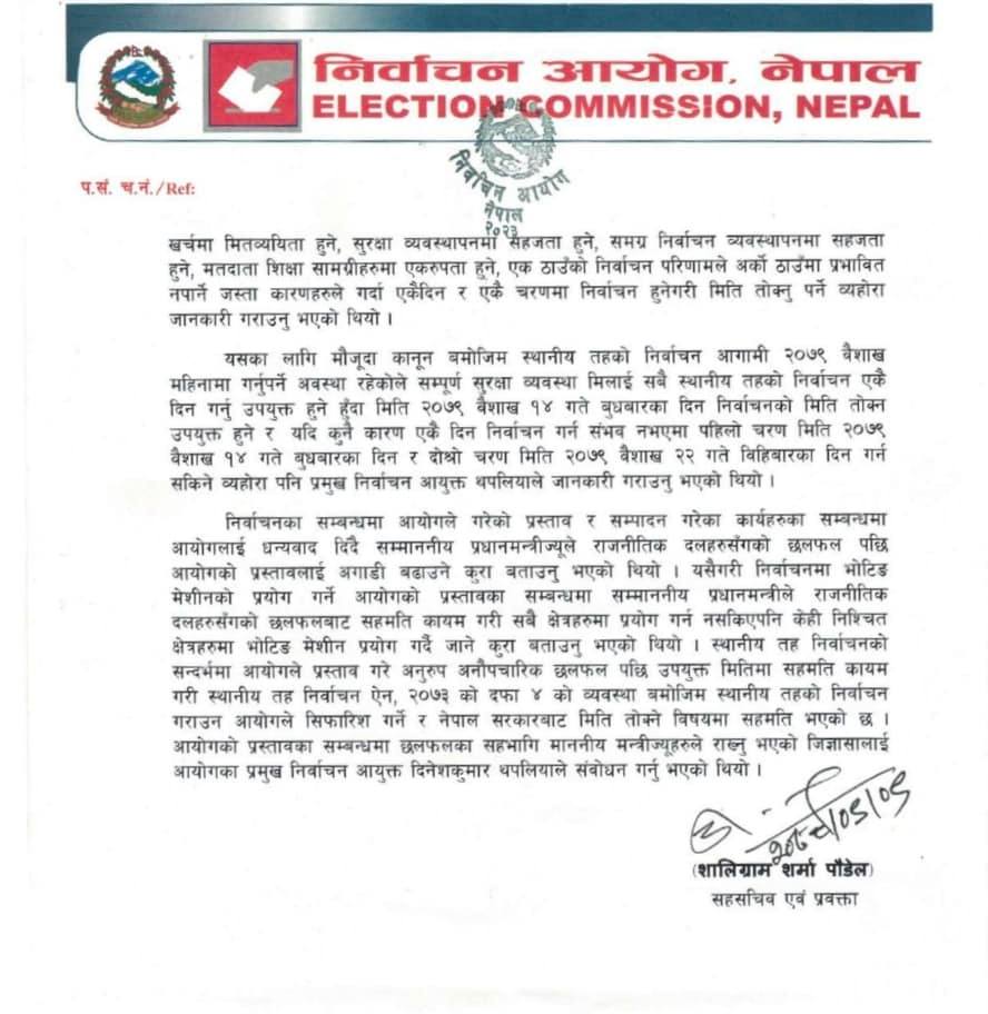 – निर्वाचन आयोगले आउँदो वैशाख १४ र २२ गते पालिकाको चुनाव गर्न सरकारसमक्ष प्रस्ताव गरेको छ । प्रधानमन्त्री शेरबहादुर देउवा तथा मन्त्रीहरूसँग आज शुक्रवार भएको छलफलमा प्रमुख निर्वाचन आयुक्त दिनेश थपलियाले पहिलो चरणमा वैशाख १४ गते र दोस्रो चरणको २२ गते चुनाव गर्न सक्ने जानकारी दिनुभएको हो ।
