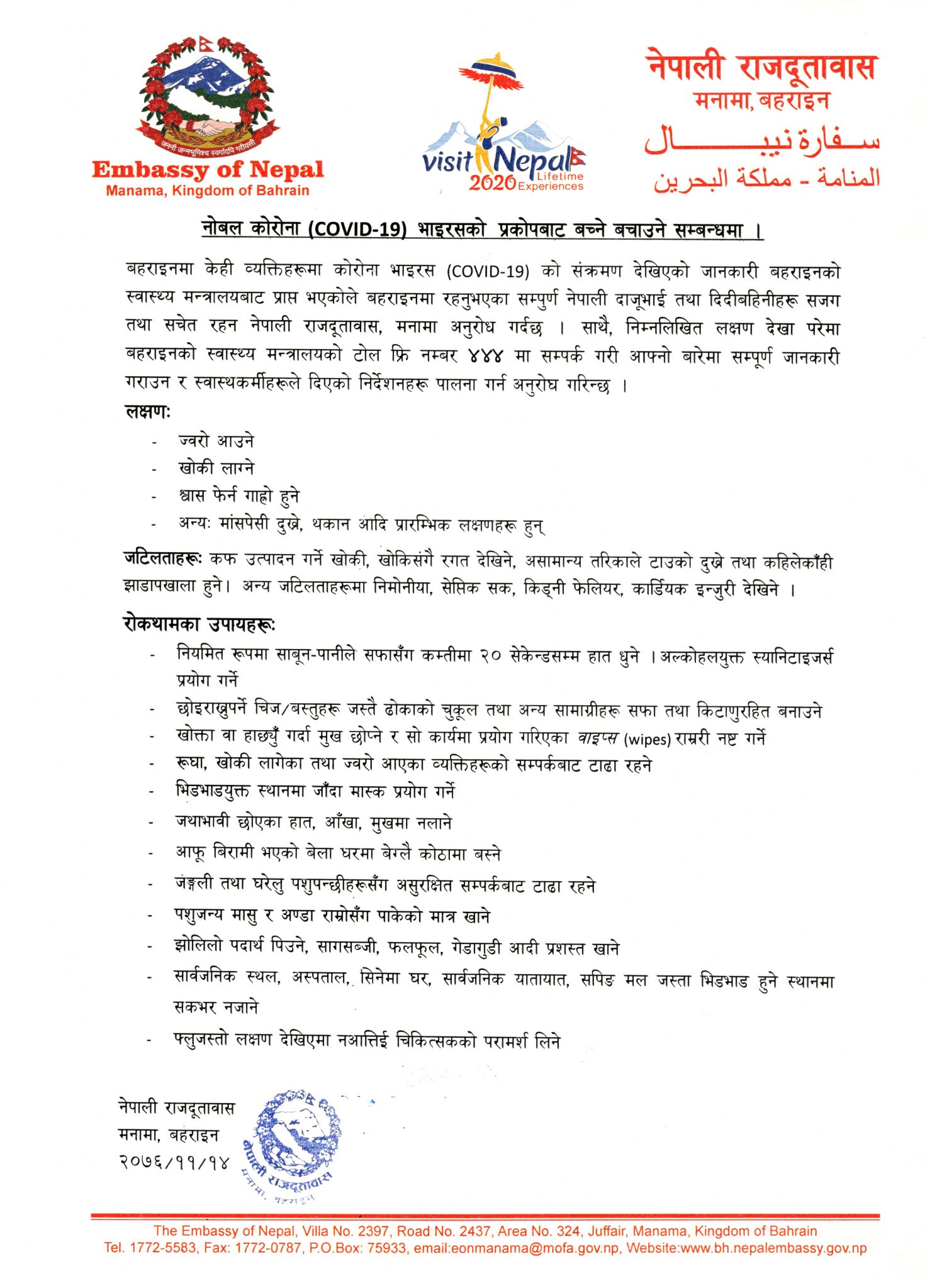 बहराइन र कुवेतमा रहेका नेपाली दूतावासले कोरोना भाइरसको लक्षणको जानकारीसहित त्यहाँ रहेका नेपालीलाई सावधानी अपनाउन अनुरोध गरेका छन् ।