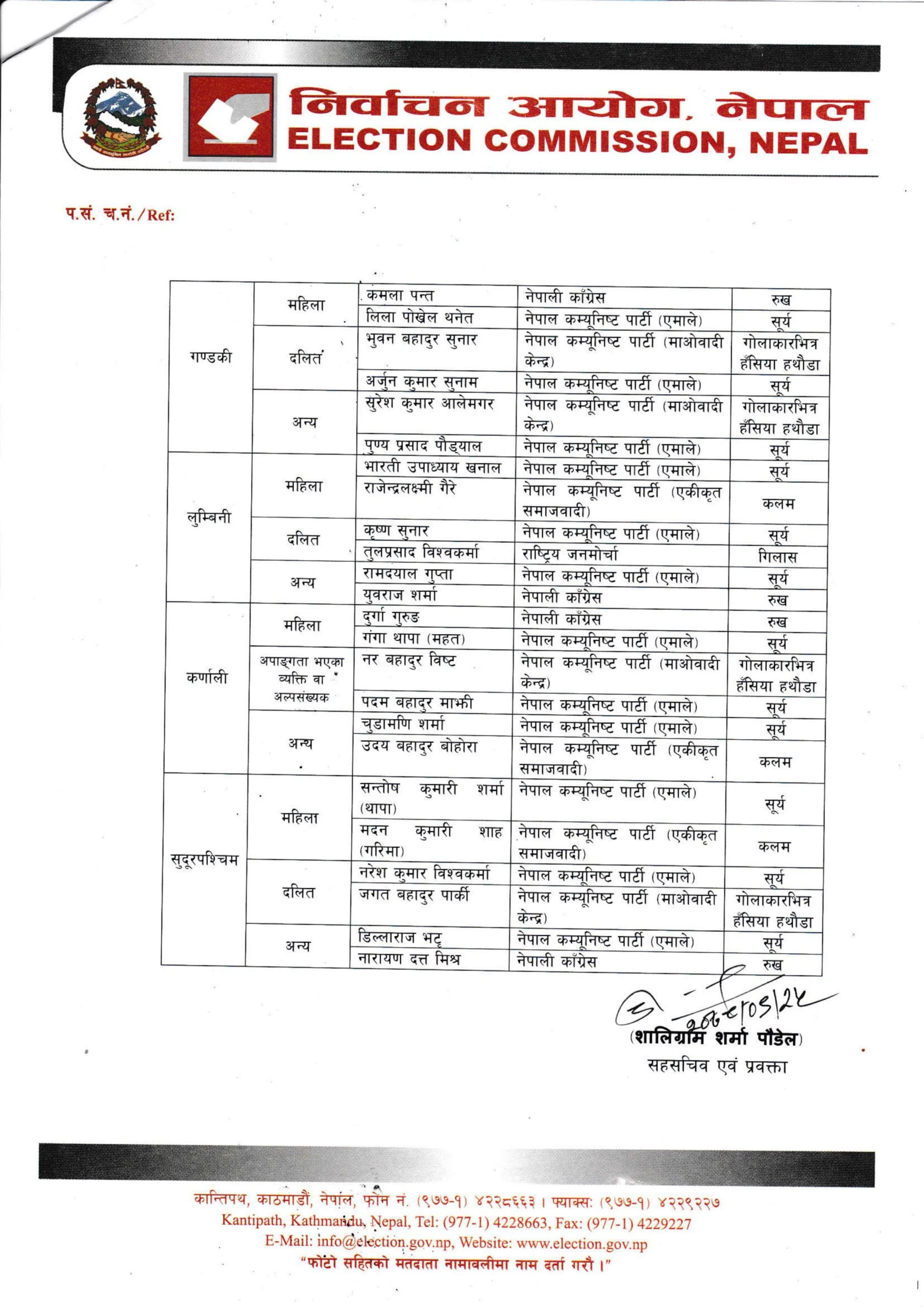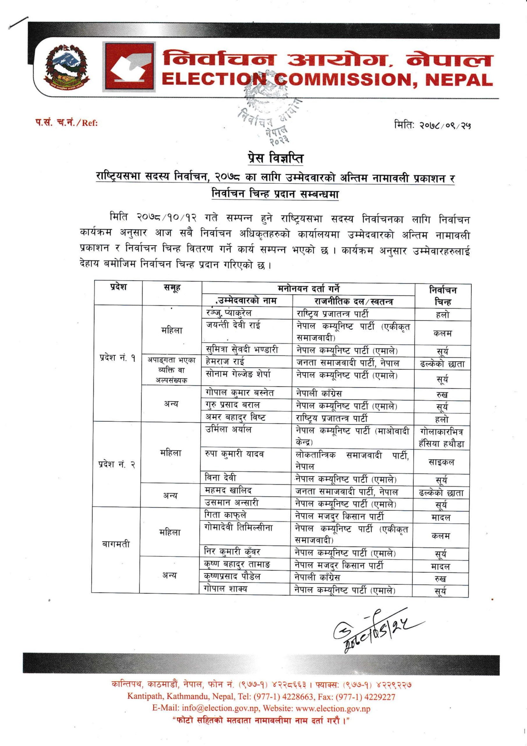आयोगले आइतबार प्रेस विज्ञप्ति जारी गर्दै राष्ट्रियसभा सदस्य निर्वाचन उम्मेदवारको अन्तिम नामावली प्रकाशन गर्दै चुनाव चिन्ह प्रदान गरेको हो ।