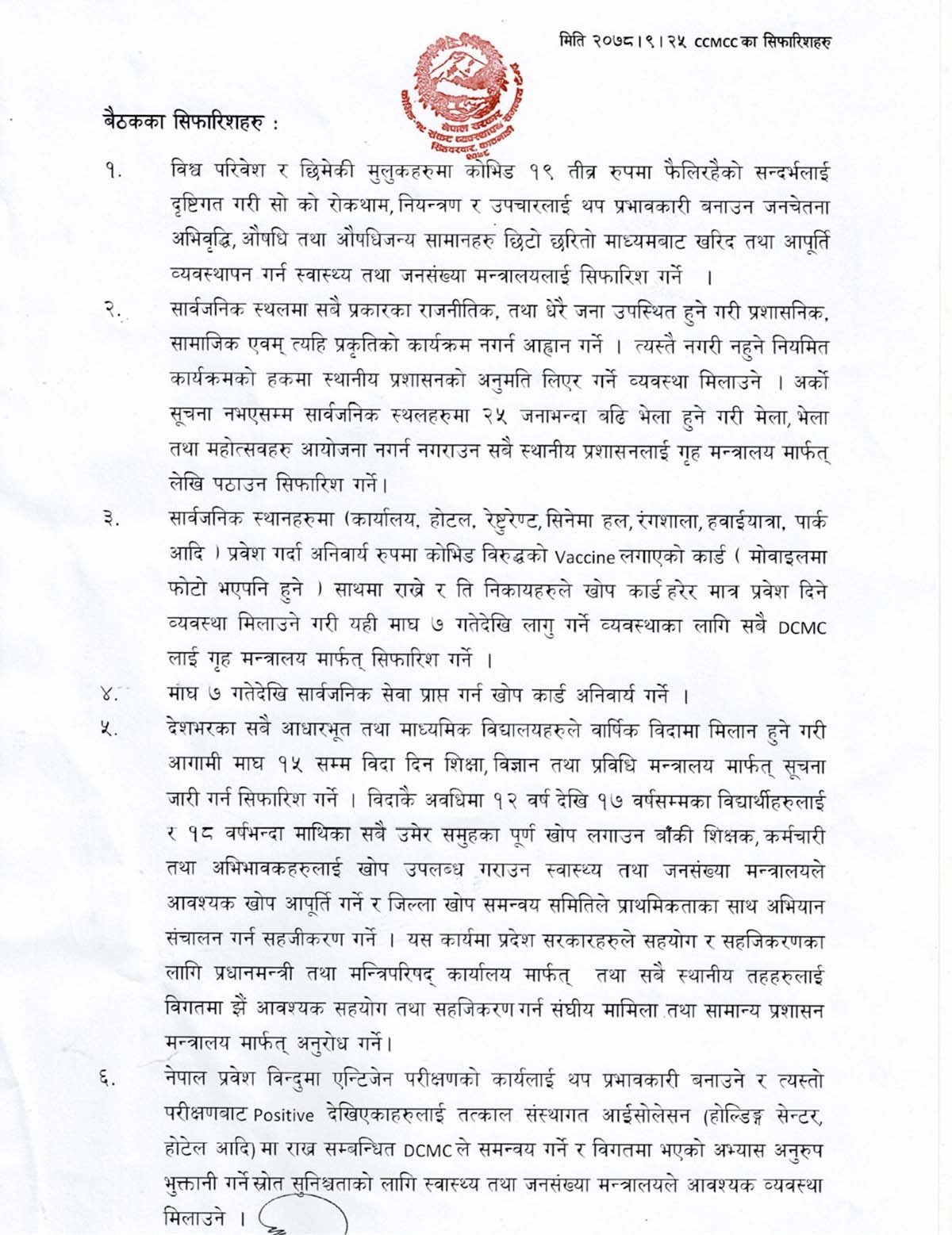 त्यसैगरी २५ जना भन्दा बढीलाई भेला हुन नदिन गृह मन्त्रालयलाई सिफारिस गरेको छ भने सार्वजनिक स्थलमा माघ ७ गतेदेखि कोभिड कार्ड अनिवार्य गर्न गृह मन्त्रालयलाई सिफारिस गरेको छ ।