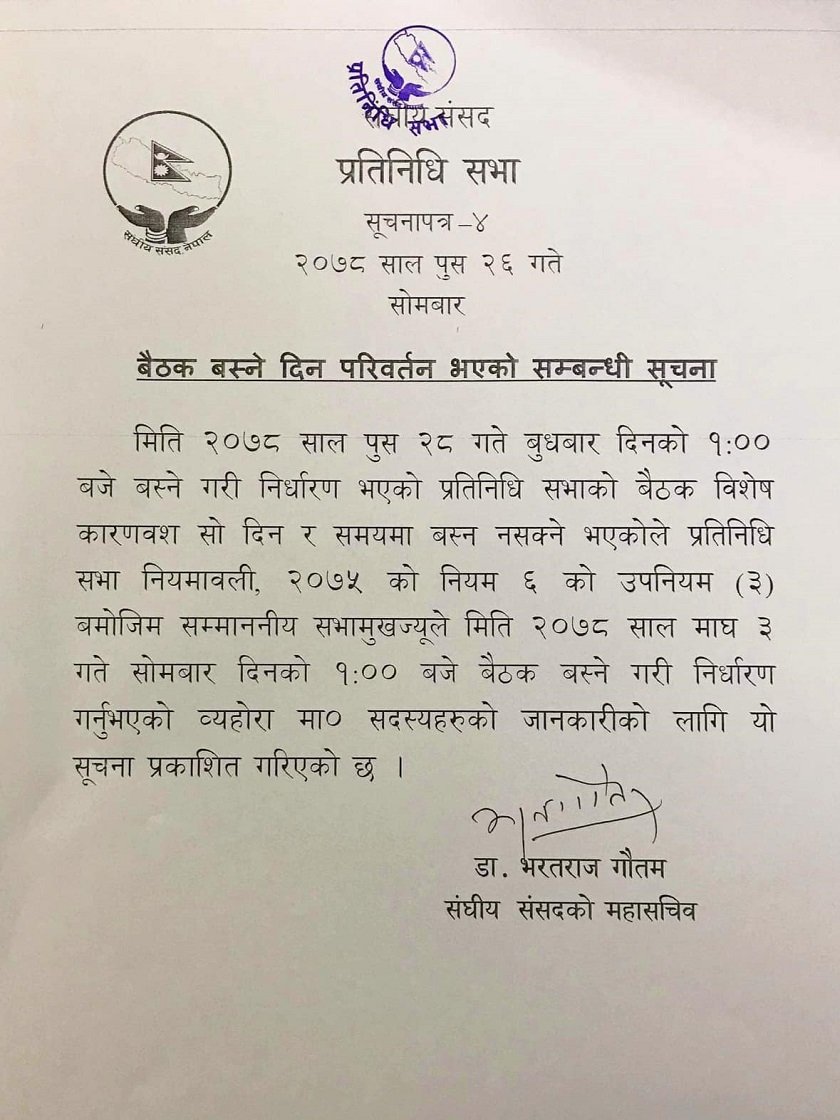 ‘मिति २०७८ साल पुस २८ गते बुधबार दिनको १ः ०० बजे बस्ने गरी निर्धारण भएको प्रतिनिधि सभाको बैठक विशेष कारणवश सो दिन र समयमा बस्न नसक्ने भएकोले प्रतिनिधि सभा नियमावली, २०७५ को नियम ६ को उपनियम (३) बमोजिम सम्माननीय सभामुखज्यूले मिति २०७८ साल माघ ३ गते सोमबार दिनको १ः ०० बजे बैठक बस्ने गरी निर्धारण गर्नुभएको व्यहोरा मा। सदस्यहरुको जानकारीको लागि यो सूचना प्रकाशित गरिएको छ,’ सचिवालयका महासचिव डा.भरतराज गौतमले जारी गरेको सूचनामा उल्लेख छ ।