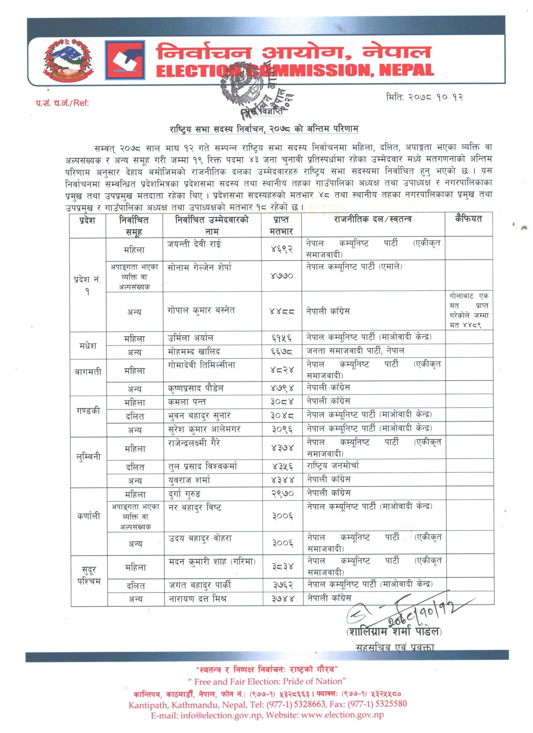 निर्वाचन आयोगले बुधबार राति सार्वजनिक गरेको नतिजा अनुसार प्रदेश १ मा गोपाल कुमार बस्नेत, सोनाम गेल्जेन शेर्पा, जयन्ती देवी राई, मधेस प्रदेशमा उर्मिला अर्याल, मोहम्मद खालिद, बागमतीमा गोमादेवी तिमिल्सना, कृष्ण प्रसाद पौडेल, गण्डकीमा कमला पन्त, भुवन बहादुर सुनार, सुरेश आले मगर, लुम्बिनीमा राजेन्द्र लक्ष्मी गैरे, तुल प्रसाद विश्वकर्मा, युवराज शर्मा, कर्णालीमा दुर्गा गुरुङ, नरबहादुर विष्ट, उदयबहादुर बोहरा र सुदूरपश्चिममा मदन कुमारी शाह, जगद बहादुर पार्की र नारायणदत्त मिश्र विजयी भएका छन् ।