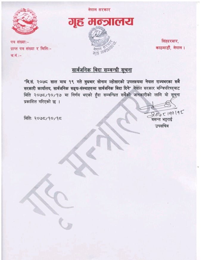 काठमाडौं – सरकारले तामाङको सांस्कृतिक पर्व सोनाम ल्होसारमा देशभर सार्वजनिक बिदा दिने निर्णय गरेको छ । गृह मन्त्रालयले मंगलबार विज्ञप्ति जारी गर्दै सोमबार बसेको मन्त्रिपरिषद् बैठकले बुधबार सार्वजनिक बिदा दिने निर्णय गरेको जानकारी दिएको छ ।