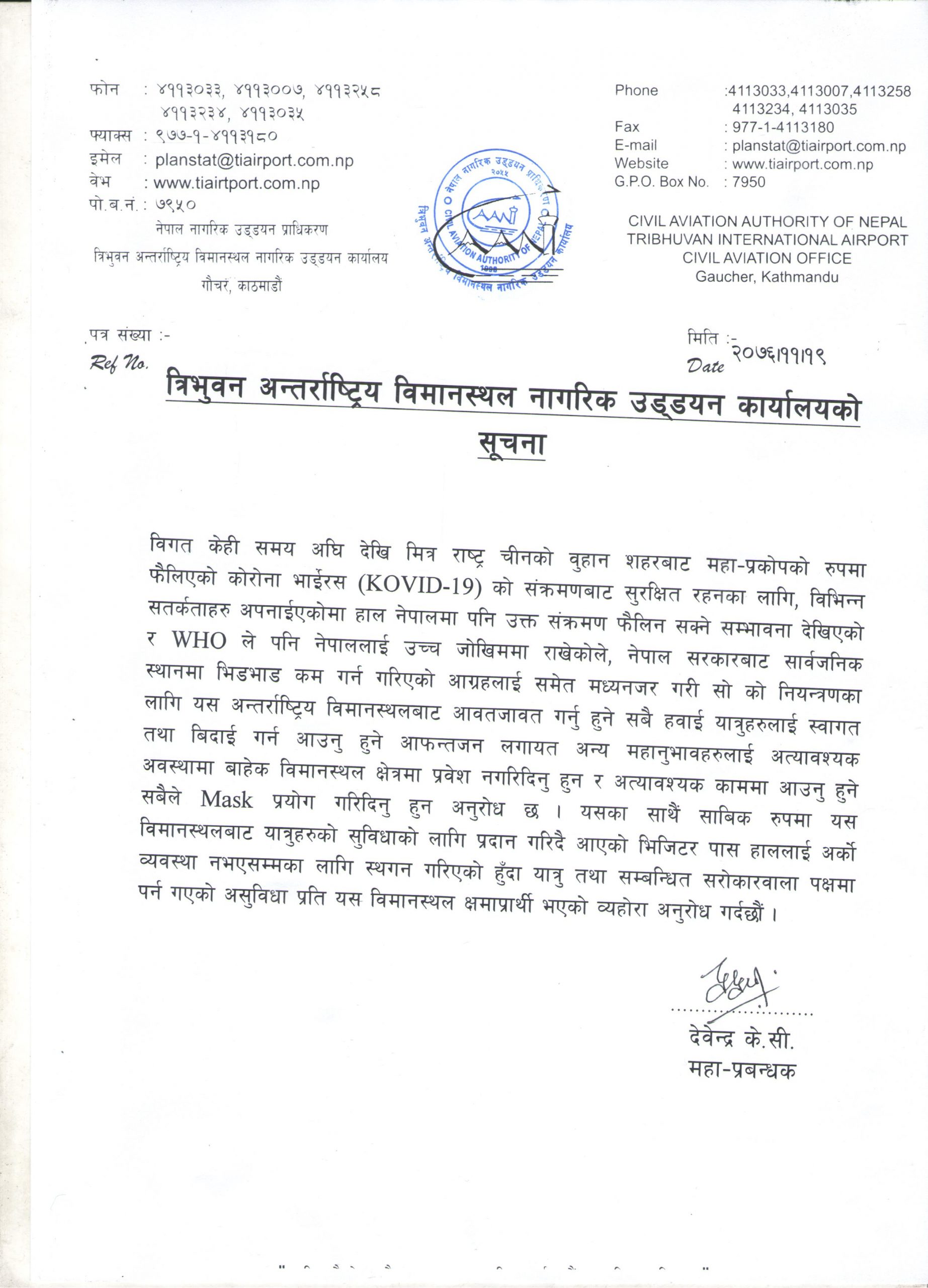 त्रिभुवन विमानस्थले अत्यावश्यक कामबाहेक विमानस्थलमा उपस्थिन नहुन आग्रह गरेको छ । कोरोना भाइरसको जोखिम बढ्दै गएकाले आफन्तलाई स्वागत र बिदाइ गर्न विमानस्थलमा उपस्थित नहुन र उपस्थित हुनै परे मास्क लगाउन पनि विमानस्थल कार्यालयले आग्रह गरेको छ । हाल नेपालमा पनि संक्रमण फैलिन सक्ने सम्भावना देखिएको र डब्लु एचओ ले पनि नेपाललाई उच्च जोखिममा राखेकोले नेपाल सरकारबाट सार्वजनिक स्थानमा भिडभाड कम गर्न गरिएको आग्रहलाई समेत मध्यनजर गरी सोको नियन्त्रणका लागि त्रिभुवन अन्तर्राष्ट्रिय विमानस्थलबाट आवतजावत गर्नुहुने सबै हवाई यात्रुहरुलाई स्वागत तथा बिदाई गर्न आउन हुने आफन्त लगायत अन्यहरुलाई अत्यावश्यक अवस्था बाहेक विमानस्थल क्षेत्रमा प्रवेश नगरिदिनुहुन अनुरोध गरेको छ ।