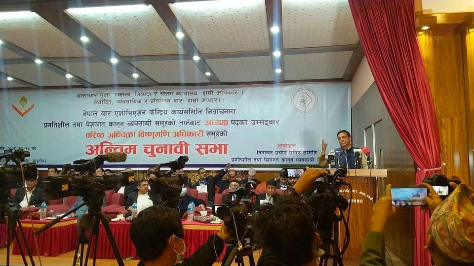 वरिष्ठ अधिवक्ता विष्णुमणि अधिकारी नेतृत्वको अन्तिम चुनावी सभामा सम्बोधन गर्नुहुदै अधिवक्ता भट्टराईले सो कुरा बताउनुभएको हो । नेपाल बारमा अहिले सरकार बस्ने पर्यत्न भईरहेको छ, २०१३ सालदेखि हालसम्म हाम्रा पुर्खाहरुले नेपाल बारमा कहिल्यै सरकारलाई प्रवेश दिएनन्, नेपाल बार जहिल्यै सरकारको प्रतिपक्षी थियोे, नेपाल बार सधै कार्यपालिकाका ज्यादतीका विरुद्धमा थियो तर अहिले बालुवाटारबाट टिकट बाडेर सरकारले नेपाल बारमा आफ्नो सहभागिता खोजेको आरोप लगाउनु भयो ।