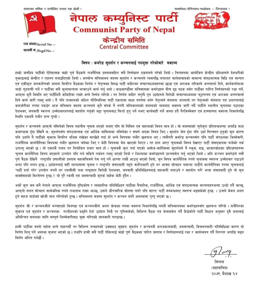 बुधबार पार्टी महासचिव विप्लवले एक विज्ञप्ति जारी गर्दै दुबैलाई पार्टीको जिम्मेवारीबाट पदमुक्त गरेको बताएका छन्। सचिवालय सदस्यसमेत रहेका उनीहरूले बैठकका निर्णय र नेतृत्वविरूद्ध काम गरेको आरोप छ। ‘बैठकका निर्णय र नेतृत्वकाविरूद्ध पार्टी बाहिरका सञ्चारमाध्यमहरूमा छाडा एवं अराजक तरिकाले अन्तर्वार्ता दिने, कार्यकर्तामाझ नांगो गुटबन्दी गर्ने र पार्टीका सबै मूल्यमान्यता भत्काउने कार्य गर्नुभयो,’ विज्ञप्तिमा उल्लेख छ।