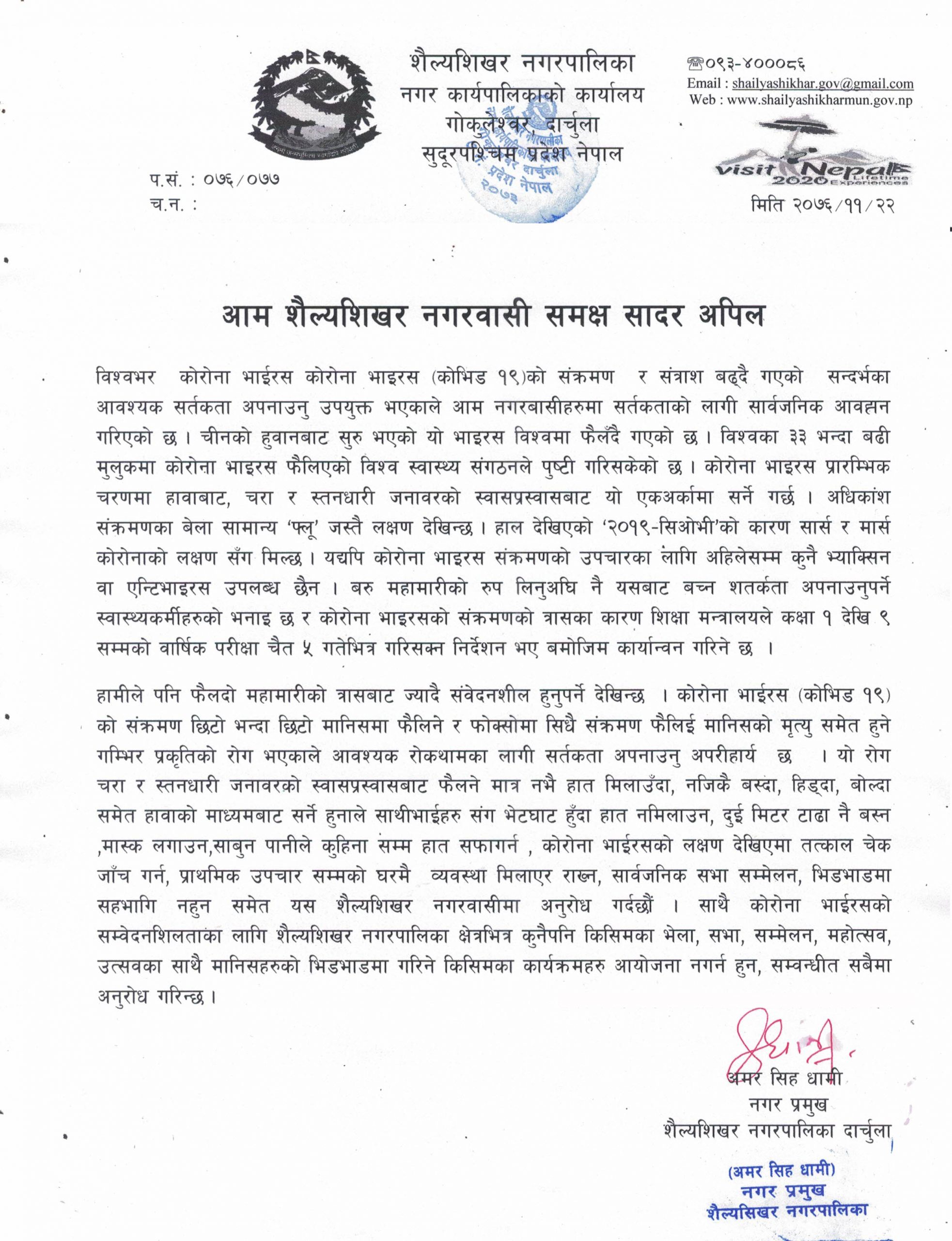 साथै कोरोना भाईरसको सम्वेदनशिलताका लागि शैल्यशिखर नगरपालिका क्षेत्रभित्र कुनैपनि किसिमका भेला, सभा, सम्मेलन, महोत्सव, उत्सवका साथै मानिसहरुको भिडभाडमा गरिने किसिमका कार्यक्रमहरु आयोजना नगर्न हुन, सम्वन्धीत सबैमा अनुरोध गरिन्छ ।