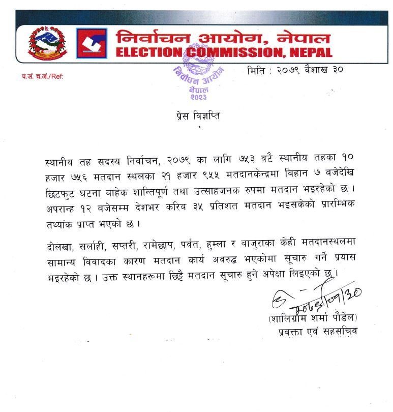 काठमाडौँ — स्थानीय तह निर्वाचन २०७९ मा शुक्रबार बिहानैदेखि उत्साहजनक रूपमा मतदान भइरहेको निर्वाचन आयोगले जनाएको छ । निर्वाचन आयोगका अनुसार १२ बजेसम्म देशभर करिब ३५ प्रतिशत मतदान भएको छ ।