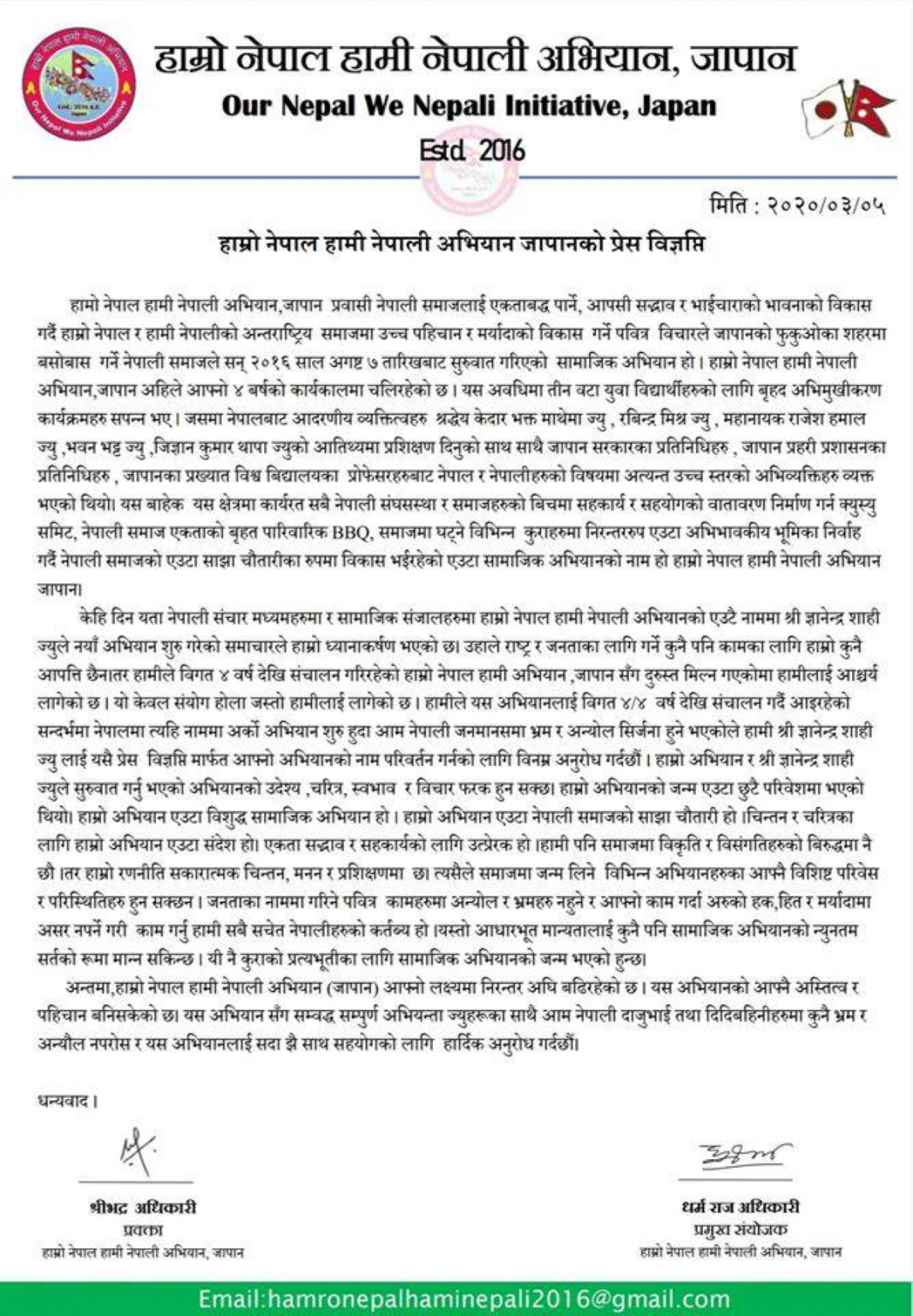 विहिवार हाम्रो नेपाल हामी नेपाली अभियान, जापानले एक विज्ञप्ती जारी गर्दै ज्ञानेन्द्र शाहीको नेतृत्वमा भोषणा गरिएको हाम्रो नेपाल हामी नेपाली अभियानको नाम परिवर्तन गर्न अनुरोध गरेको छ । विगत ४ बर्षदेखि सञ्चालनमा रहेको हाम्रो नेपाल हामी नेपाली अभियान, जापनसँग ज्ञानेन्द्र शाहीको अभियानको नाम मिल्न गएकोले उक्त नाम परिवर्तन गर्न अनुरोध गरिएको छ । साथै अध्ययन नै नगरी उक्त नाम राखेको भन्दै आपत्ती समेत जनाएको छ ।