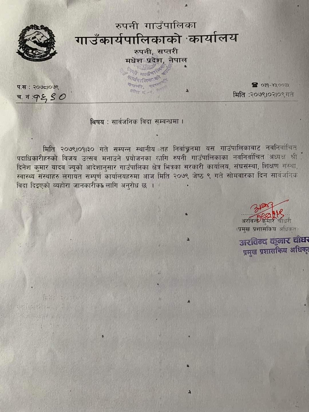 वैशाख ३० गते भएको स्थानीय तह चुनावबाट रूपनीको अध्यक्षमा निर्वाचित दिनेशकुमार यादवले आफ्नो विजयोत्सव मनाउन गाउँपालिकाभरि विदा दिन निर्देशन दिएका हुन्।