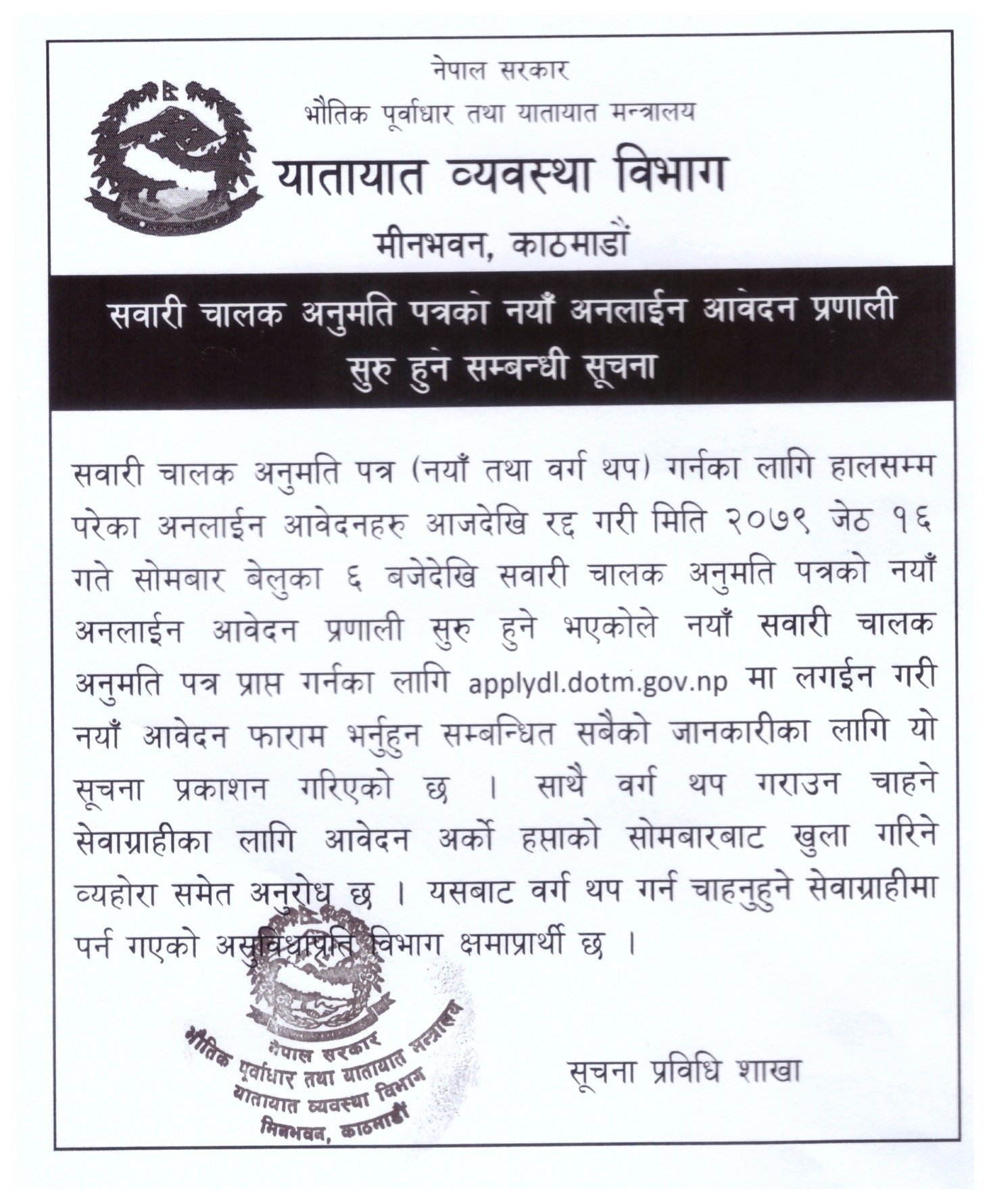 ‘सवारीचालक अनुमति पत्रका लागि हालसम्म परेका अनलाइन आवेदनहरु आजदेखि रद्द गरि जेठ १६ गेत बेलुका ६ बजेदेखि नयाँ लाइसेन्स आवेदन प्रणाली सुरु हुने भएको छ’ विभागको सूचनामा भनिएको छ ‘जसका लागि applydl.dotm.gov.np मा लागईन गरि नयाँ आवेदन फारम भर्नुहुन अनुरोध छ’ । त्यस्तै वर्ग थपको लागि भने अर्को हप्ता सोमबारबाट खुल्ला गरिने विभागले जनाएको छ ।