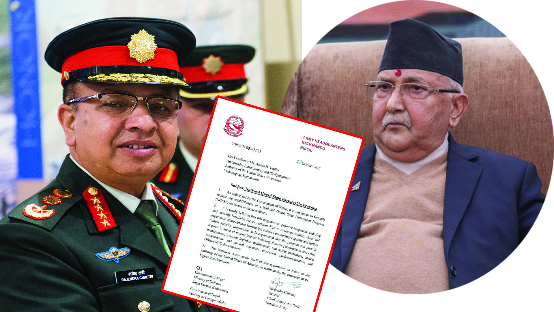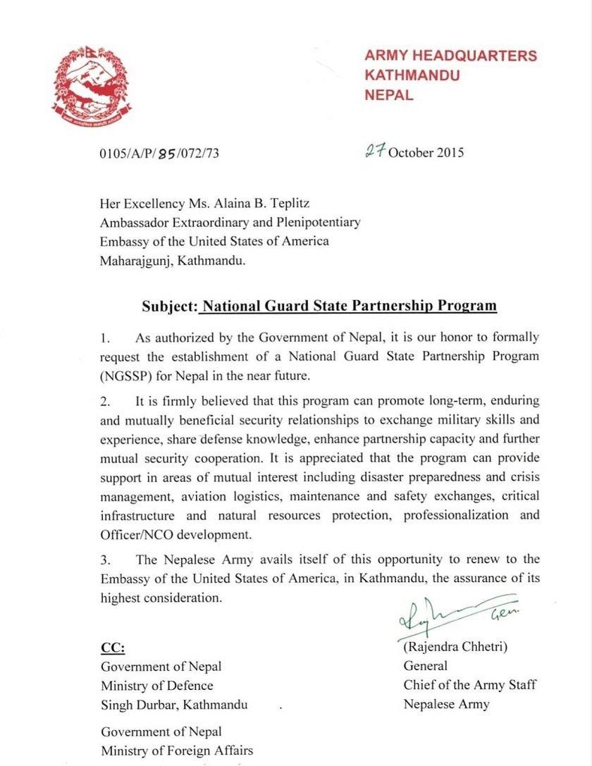 काठमाडौँ – स्टेट पाटर्नसिप प्रोग्राम (एसपीपी) मा साझेदारीका लागि नेपाली सेनाले अमेरिकालाई पत्र पठाएको खुलासा भएको छ । सन् २०१५ अगस्ट २७ मा तत्कालिन नेपाली सेनाका प्रधानसेनापति राजेन्द्र क्षेत्रीले हस्ताक्षर गरेर पत्र पठाएको खुलासा भएको हो ।
