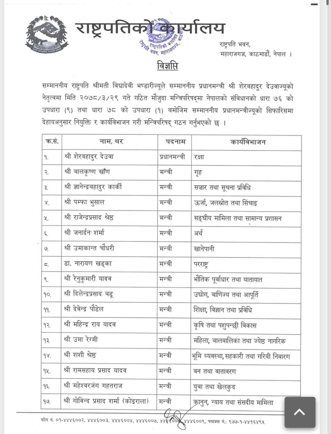 काठमाडौं – प्रधानमन्त्री शेरबहादुर देउवाले आइतबार मन्त्रिपरिषद् पुनर्गठन गरेका छन् । पुनर्गठित मन्त्रिपरिषद्मा नेकपा एकीकृत समाजवादीबाट सरकारमा सहभागी मन्त्रीहरु हेरफेर भएका छन् । राष्ट्रपति कार्यालयले विज्ञप्ति जारी गर्दै प्रधानमन्त्री देउवाले मन्त्रिपरिषद पुनर्गठन गरेको जनाएको हो ।