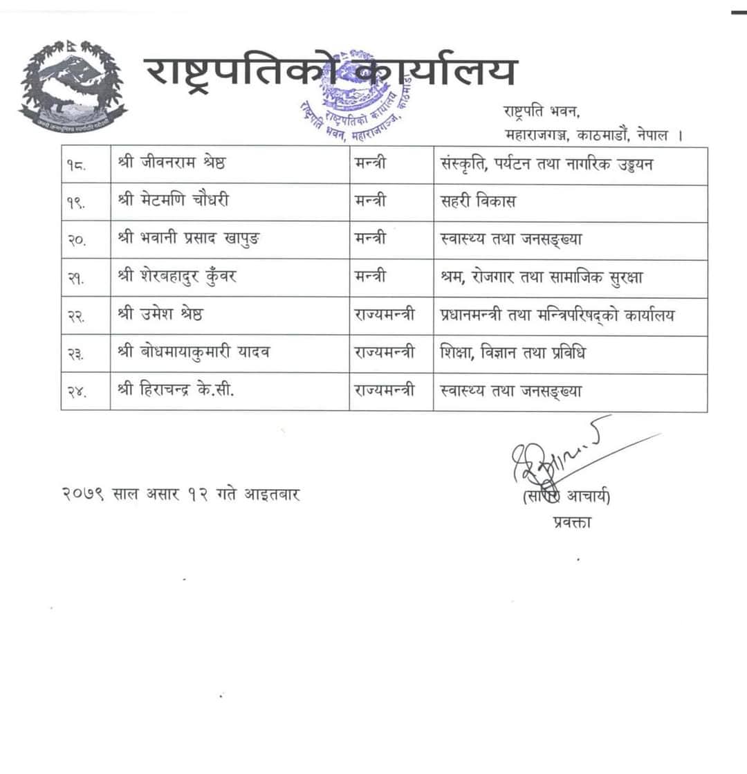 राष्ट्रपति कार्यालयका अनुसार एकीकृत समाजवादीका जीवनराम श्रेष्ठ संस्कृति पर्यटन तथा नागरिक उड्डयनमन्त्री, मेटमणि चौधरी सहरी विकास मन्त्री, शेरबहादुर कुँवर श्रम, रोजगार तथा सामाजिक सुरक्षामन्त्री, भवानी खापुङ स्वास्थ्य तथा जनसंख्या मन्त्री र हीरा केसी स्वास्थ्य तथा जनसंख्या राज्यमन्त्री बनेका छन् ।
