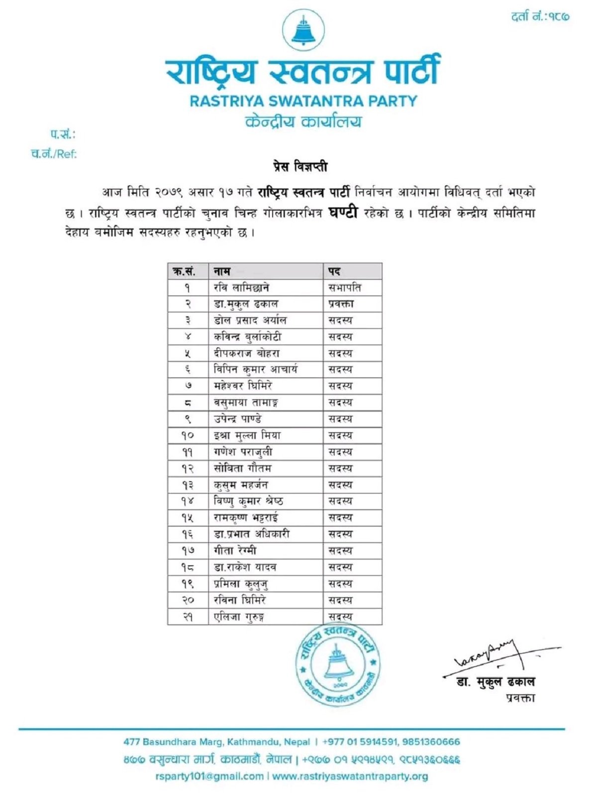 राष्ट्रिय स्वतन्त्र पार्टीले जारी गरेको विज्ञप्तिअनुसार रवि लामिछाने पार्टीका सभापति छन् डा. मुकुल ढकाल प्रवक्ता छन्। त्यस्तै बाँकी १९ जना सदस्य छन्।