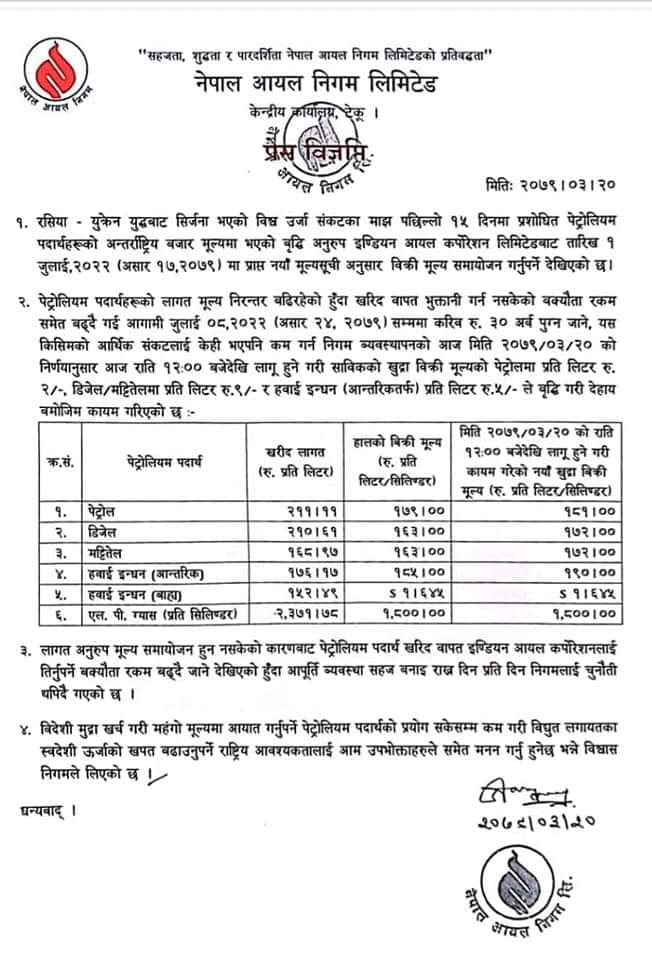 जस अनुरुप पेट्रोलमा प्रतिलिटर २ रुपैयाँ, डिजेल र मट्टितेलमा प्रतिलिटर ९ रुपैयाँ र आन्तरिकतर्फको हवाइ इन्धनमा प्रतिलिटर ५ रुपैयाँ मूल्यवृद्धि गरेको हो । सोमबार राति १२ बजेदेखि पेट्रोलको मूल्य प्रतिलिटर १८१, डिजेल र मट्टितेलको मूल्य प्रतिलिटर १७२ र आन्तरिकतर्फको हवाइ इन्धनको मूल्य प्रतिलिटर १९० पुगेको छ ।