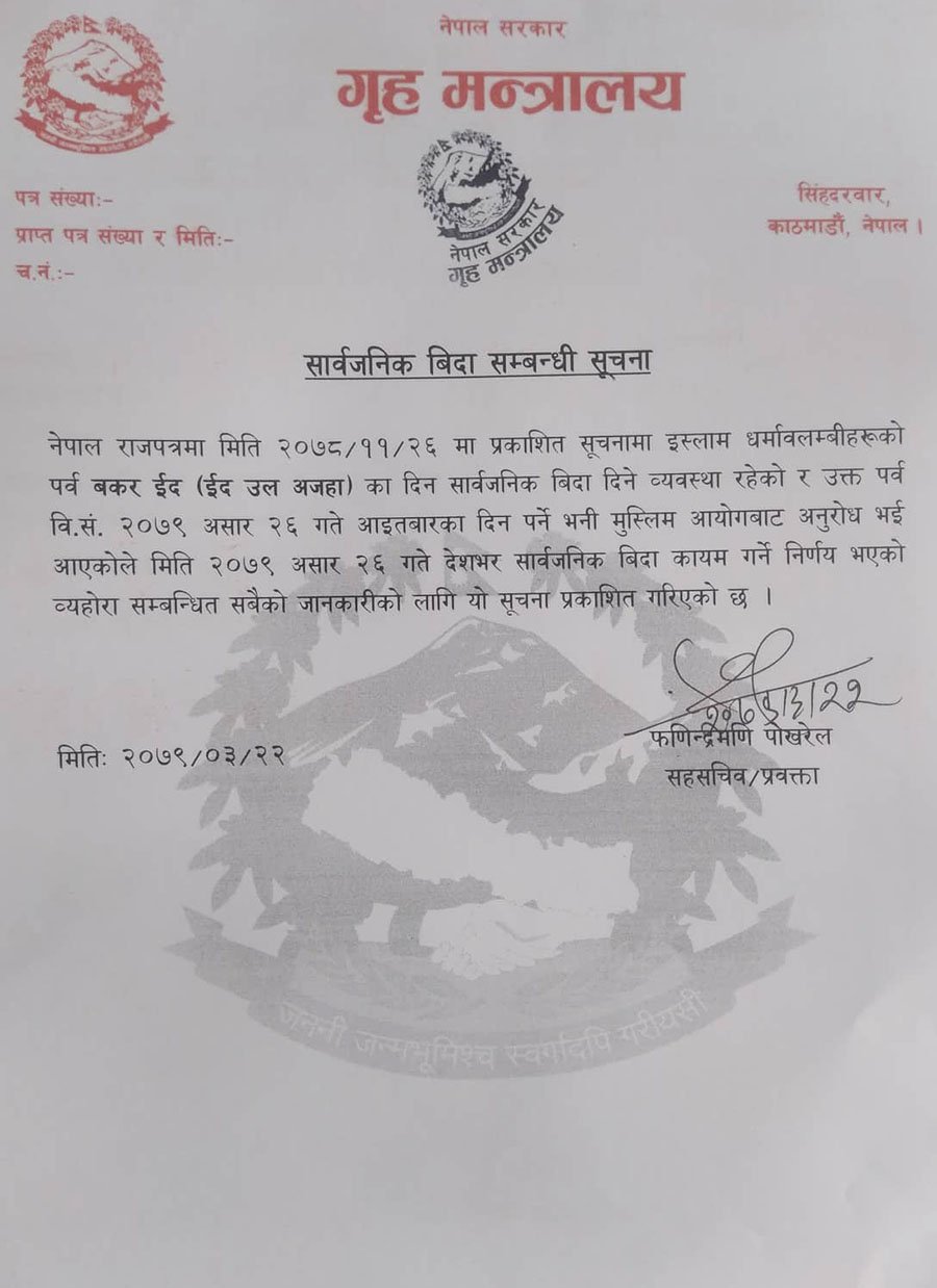 आज एक सूचना जारी गर्दै सरकारले इस्लाम धर्मावलम्बीहरुको पर्व बकर इदकालागि आइतबार विदा दिने निर्णय गरेको बताएको छ । बकर ईद असार २६ गते आइतबार पर्ने भनी मुस्लिम आयोगबाट अनुरोध आएकाले आइतबार सो दिन बिदा कायम गर्ने निर्णय गरेको गृह मन्त्रालयका प्रवक्ता सहसचिव फणिन्द्रमणि पोखरेलले जानकारी दिएका छन् । सरकारकाे याे निर्णयसँगै सबै सरकारी कार्यालय लगायत शेयर बजार, बैंक तथा वित्तीय संस्था त्यस दिन बन्द हुने भएकाे छ ।