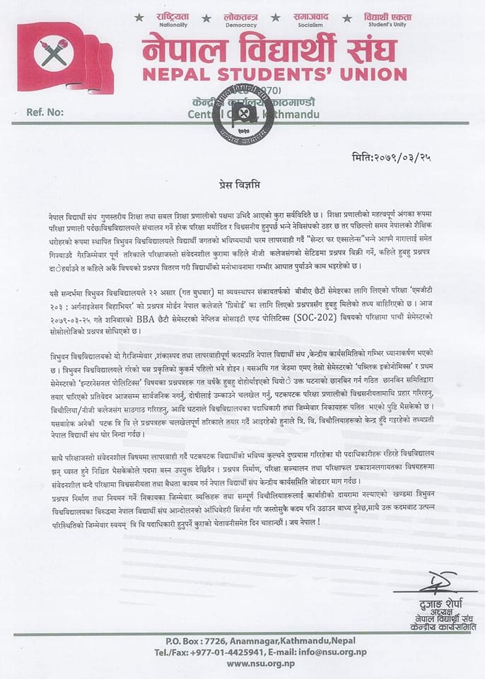‘प्रश्नपत्र निर्माण तथा नियमन गर्ने निकायका जिम्मेवार व्यक्तिहरू तथा सम्पूर्ण विचौलियाहरूलाई कार्बाहीको दायरामा नल्याएको खण्डमा त्रिविविरुद्धमा नेविसंघ आन्दोलनको आँधिबेहरी सिर्जना गरि जस्तोसुकै कदम पनि उठाउन बाध्य हुनेछ,’ विज्ञप्तिमा भनिएको छ।