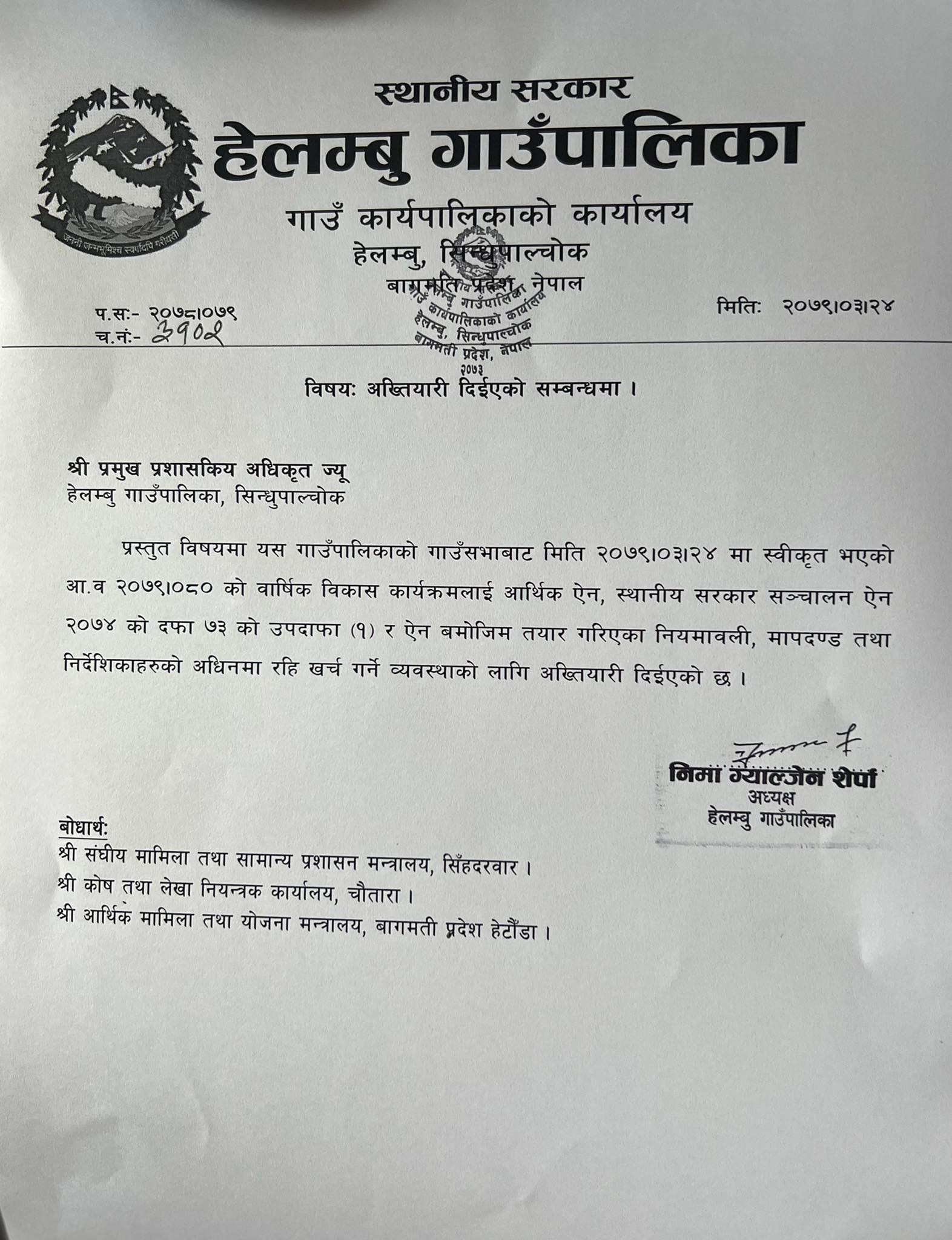 काठमाडौँ – सिन्धुपाल्चोकको हेलम्बु गाउँपालिकाका अध्यक्ष निमा ग्याल्जेन शेर्पाले आर्थिक कारोबारका लागि प्रमुख प्रशासकीय अधिकृतलाई अख्तियारी दिएको छ । असार २४ गते गाउँसभाबाट स्वीकृत भएको आर्थिक वर्ष २०७९/८०को वार्षिक विकास कार्यक्रमलाई आर्थिक ऐन, स्थानीय सरकार संचालन ऐन २०७४ को दाफा ७३को उपदाफा १ र ऐन बमोजिम तयार गरिएका नियमावली मापदण्ड तथा निर्देशिकाहरुको अधिनमा रहि खर्च गर्न अध्यक्ष शेर्पाले प्रमुख प्रशासकीय अधिकृतलाई अख्तियारी दिएका हुन् ।